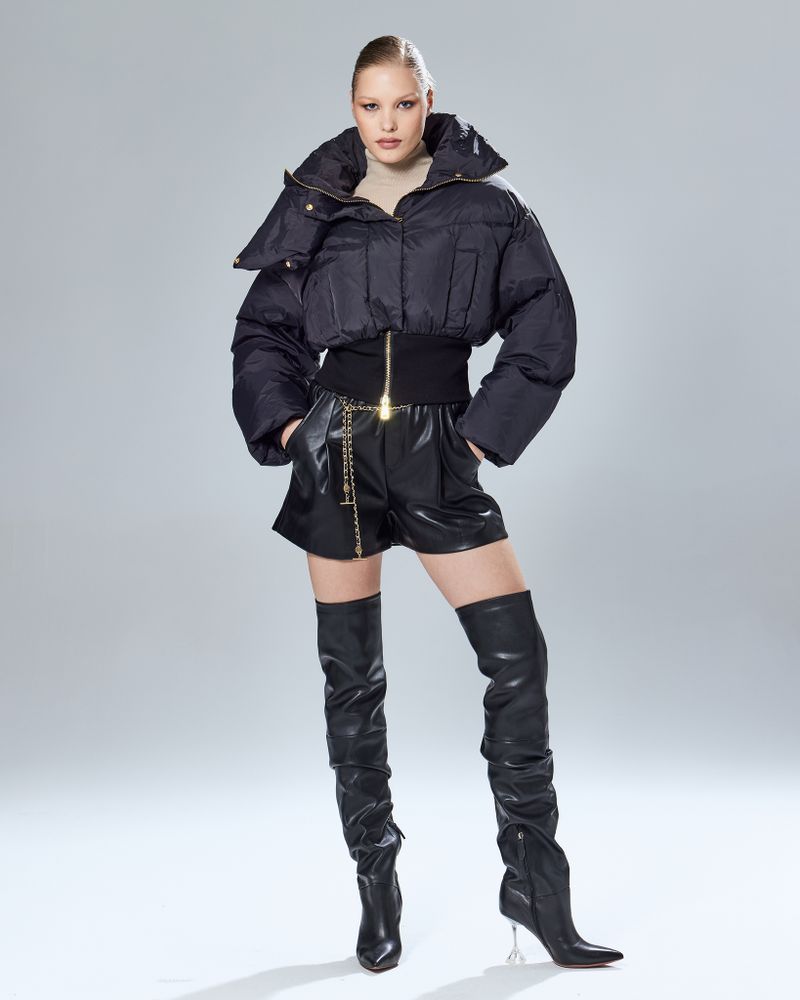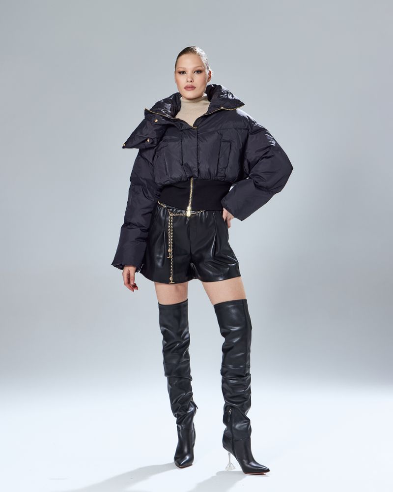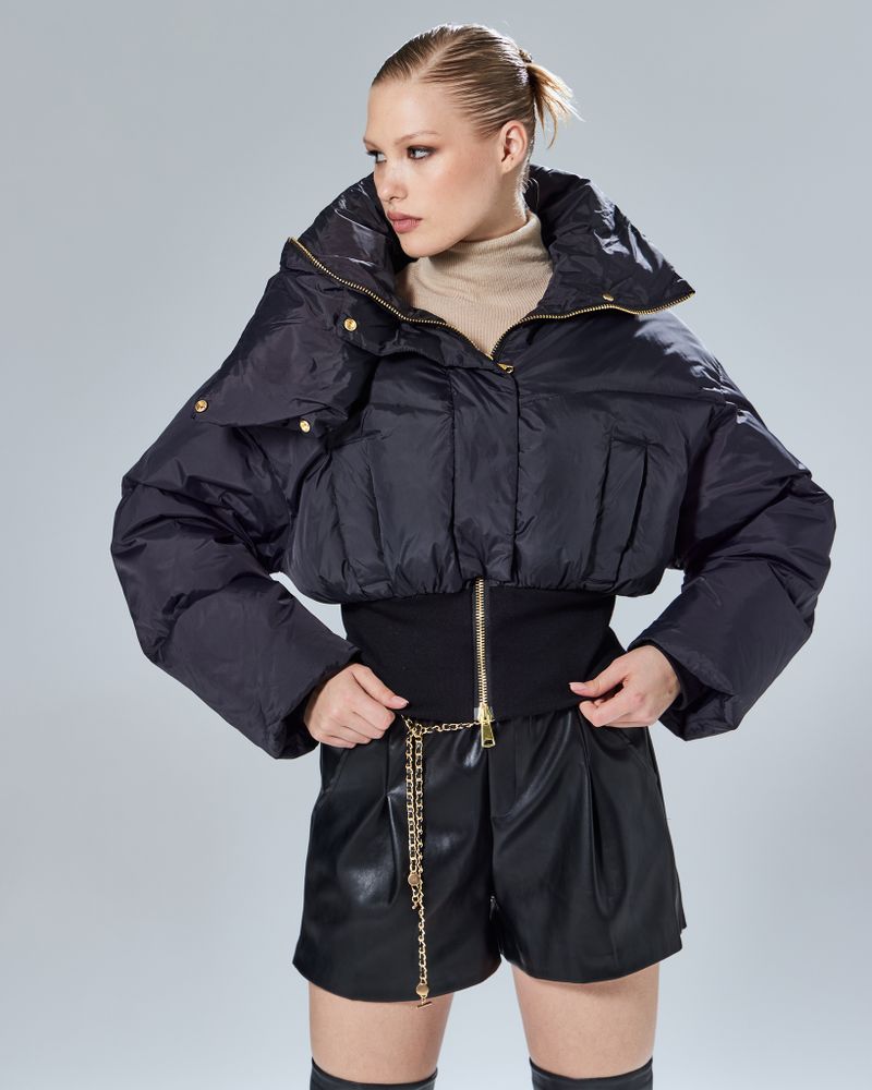 Пуховик объемный на плотной резинке с высоким воротом на молнии, очень теплый, не продувает.