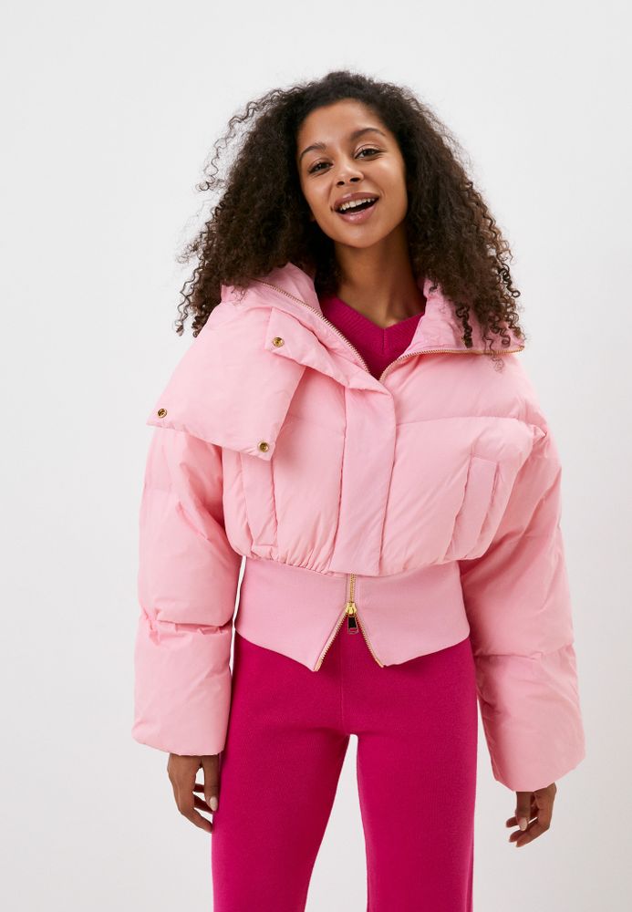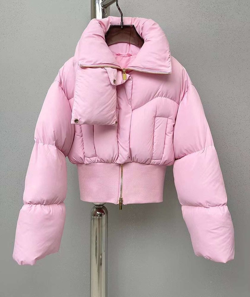 Пуховик объемный на плотной резинке с высоким воротом на молнии, очень теплый, не продувает.