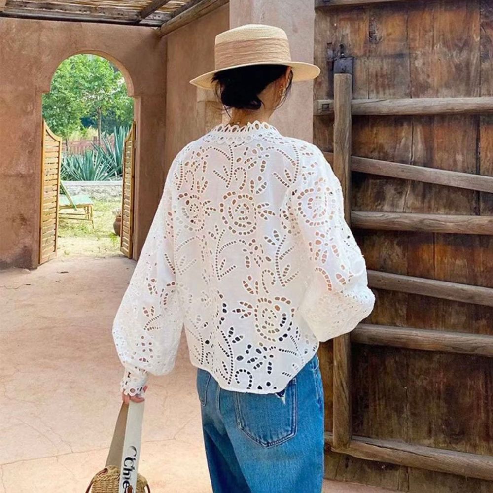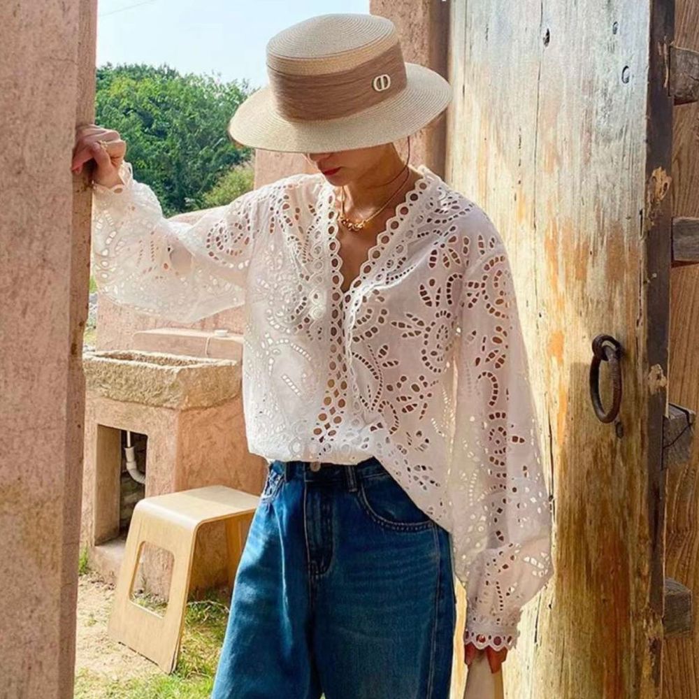 Хлопковая рубашка с вырезом и изысканной вышивкой - идеальный выбор для стильного летнего образа. Натуральная ткань и свободный крой обеспечит комфорт в любую погоду, а оригинальный дизайн добавит шарма.