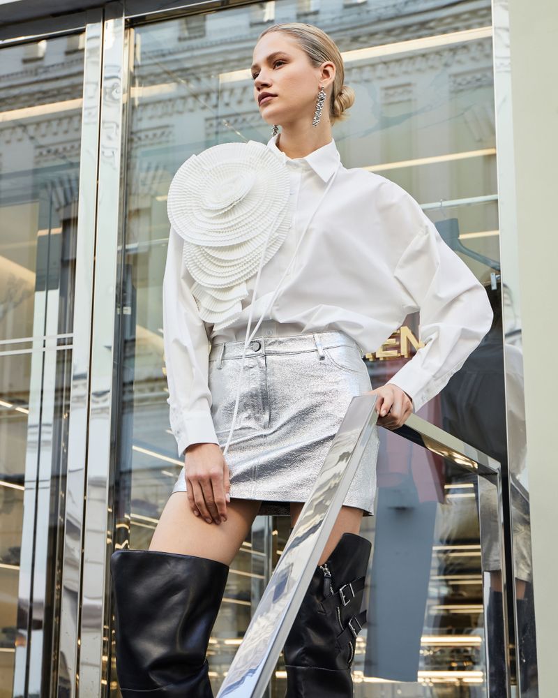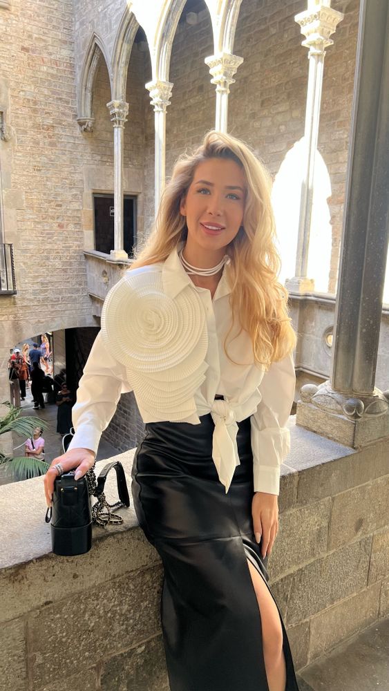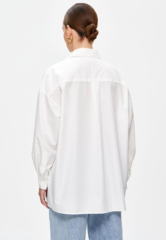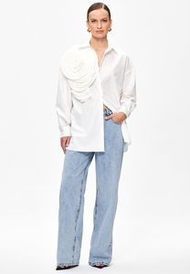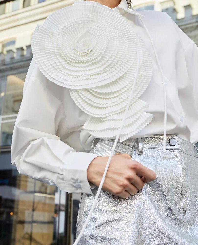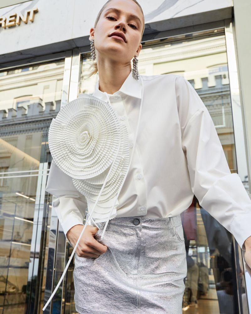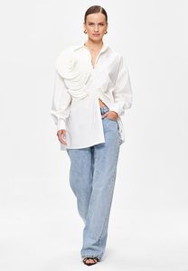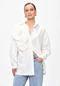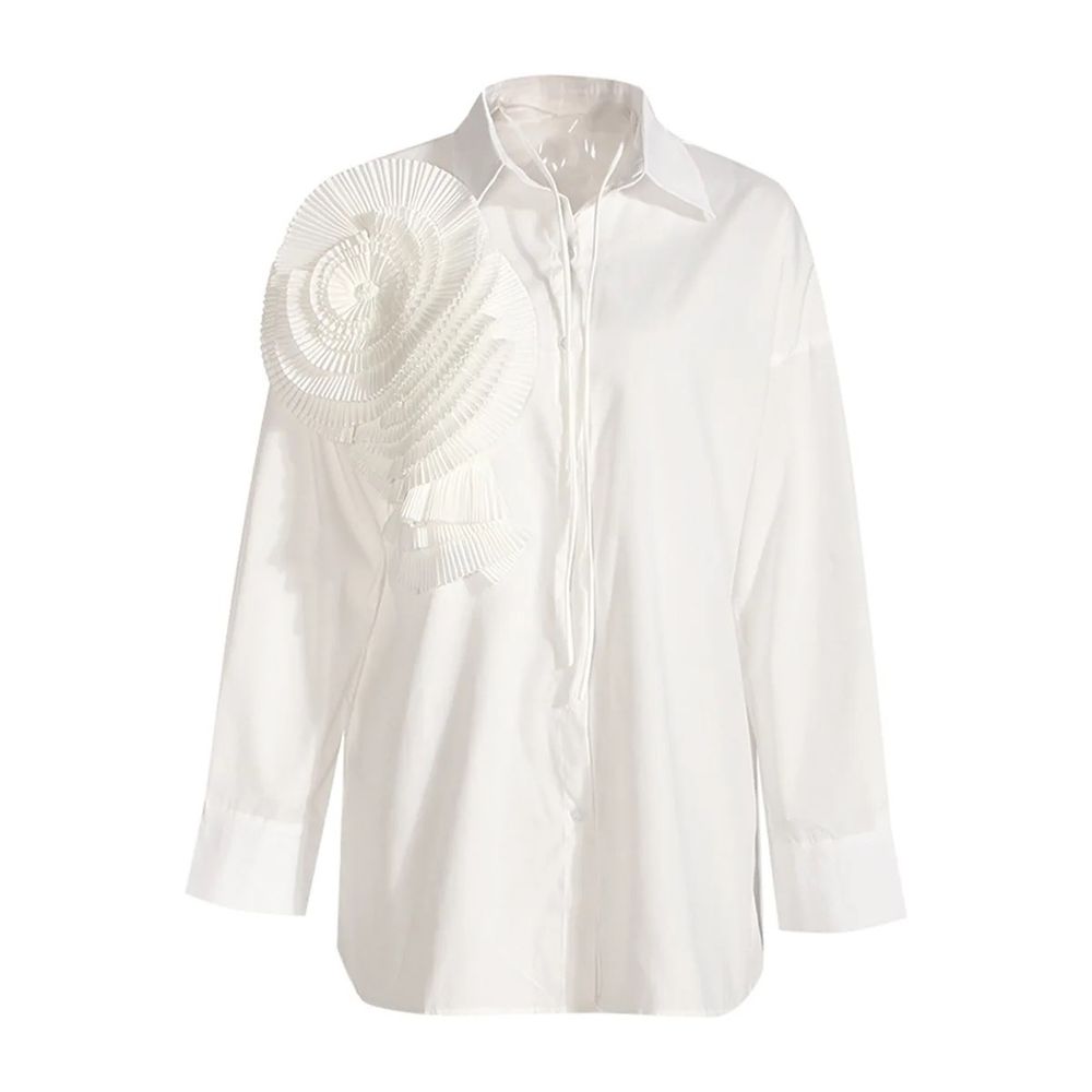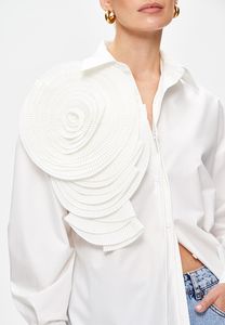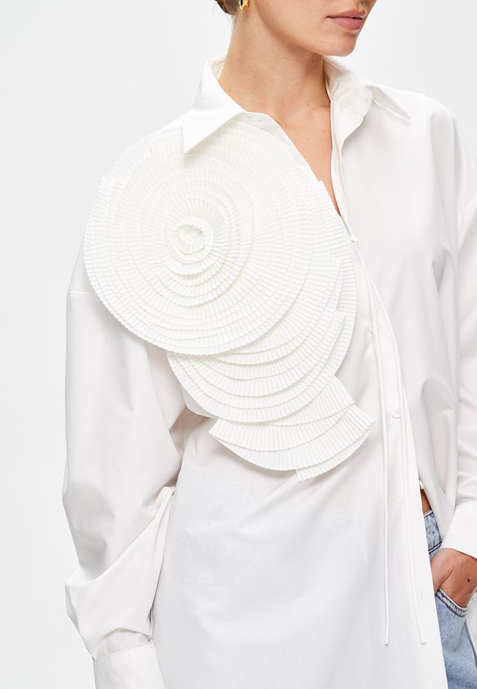 Хлопковая удлиненная рубашка с крупным гофрированным цветком на груди, застежка на пуговицы. Представлена в пяти цветах: белый, нежно голубой, лимонный, розовый, черный.