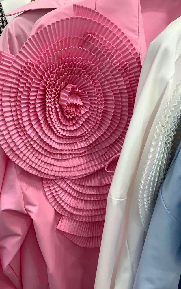 Хлопковая удлиненная рубашка с крупным гофрированным цветком на груди, застежка на пуговицы. Представлена в пяти цветах: белый, нежно голубой, лимонный, розовый, черный.