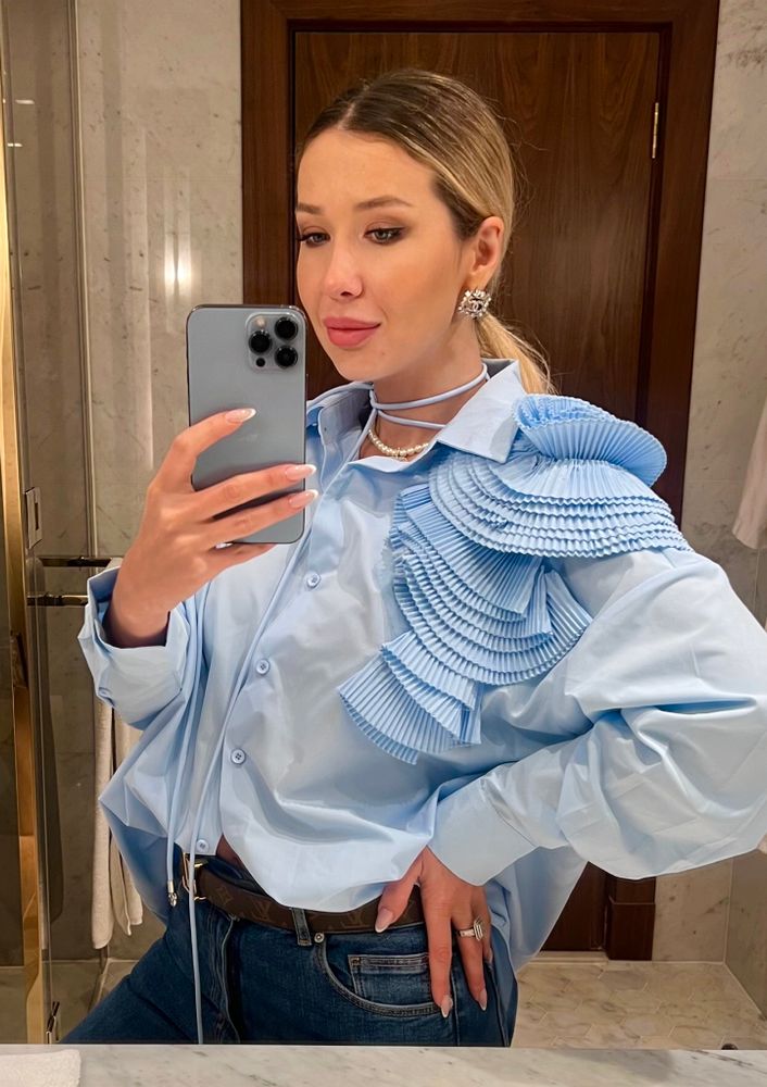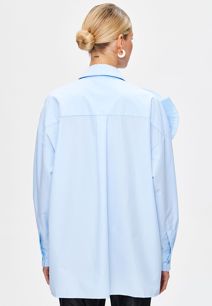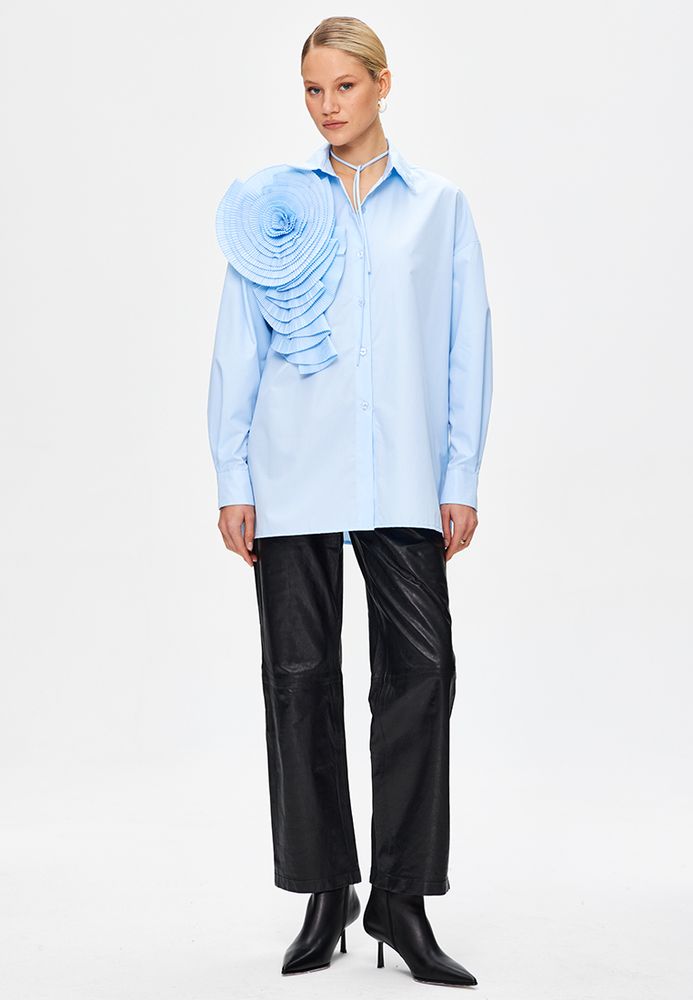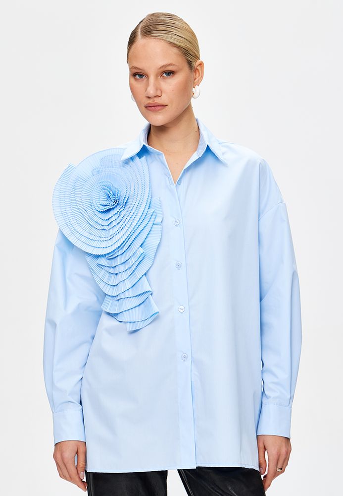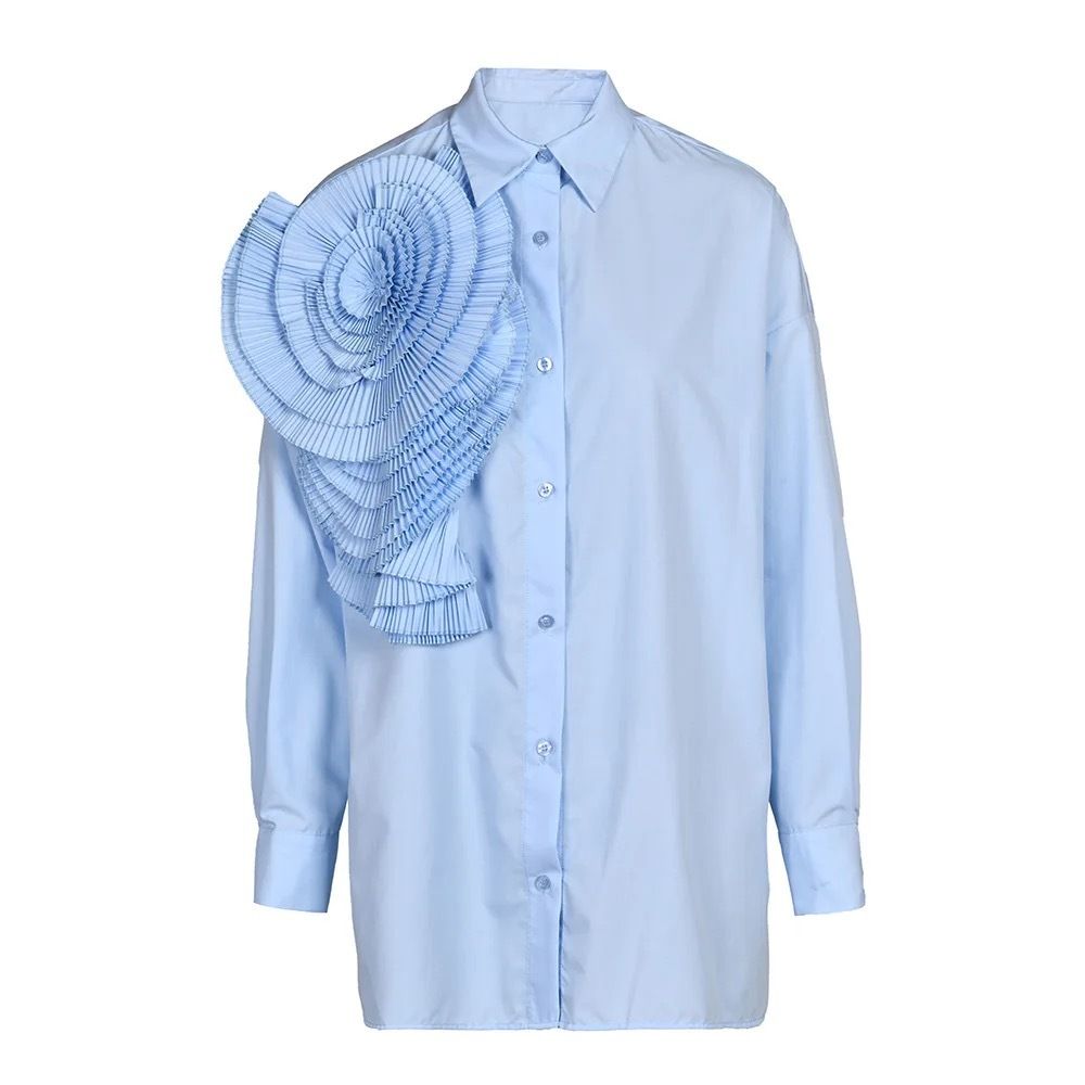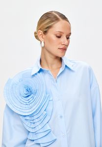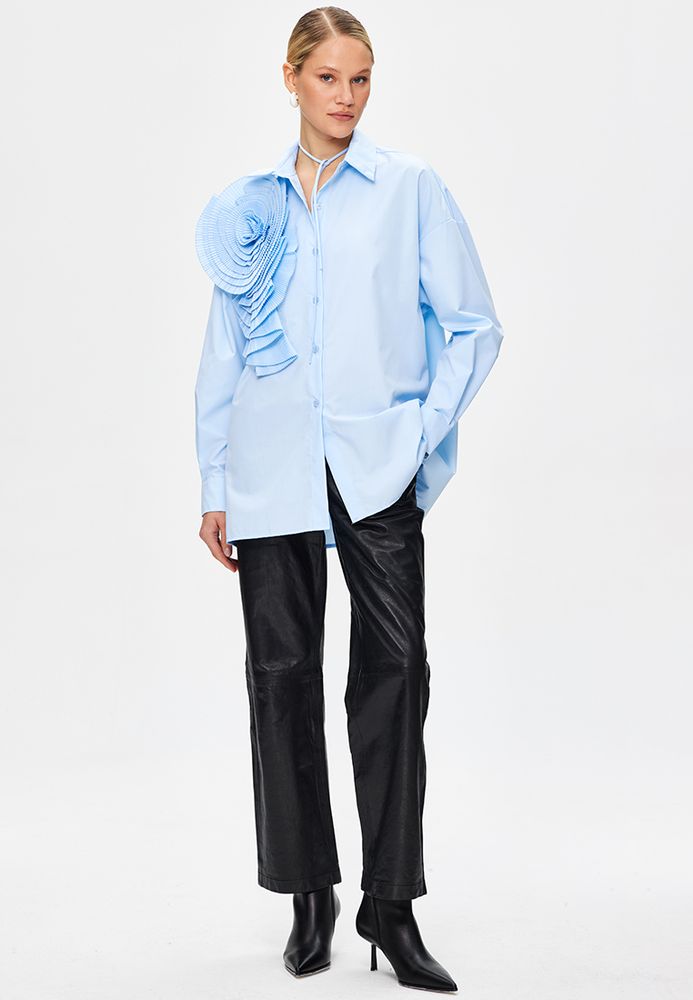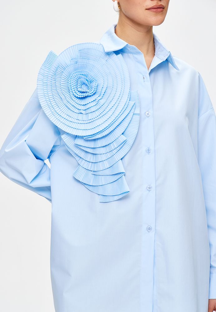 Хлопковая удлиненная рубашка с крупным гофрированным цветком на груди, застежка на пуговицы. Представлена в пяти цветах: белый, нежно голубой, лимонный, розовый, черный.