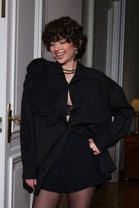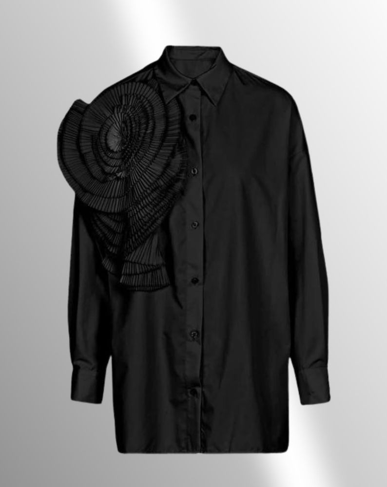 Хлопковая удлиненная рубашка с крупным гофрированным цветком на груди, застежка на пуговицы. Представлена в пяти цветах: белый, нежно голубой, лимонный, розовый, черный.