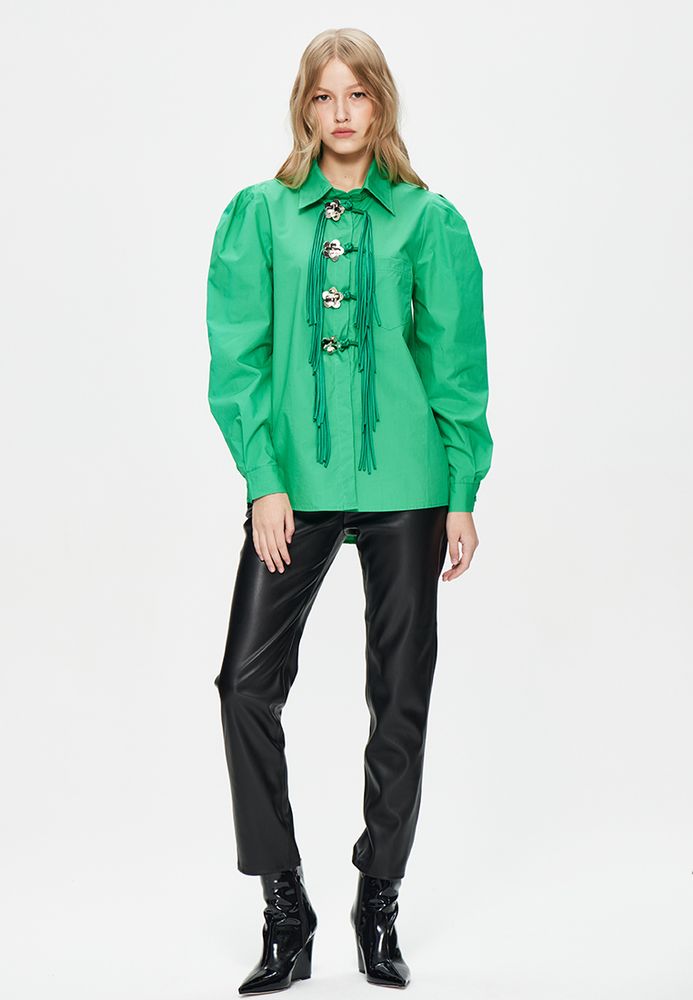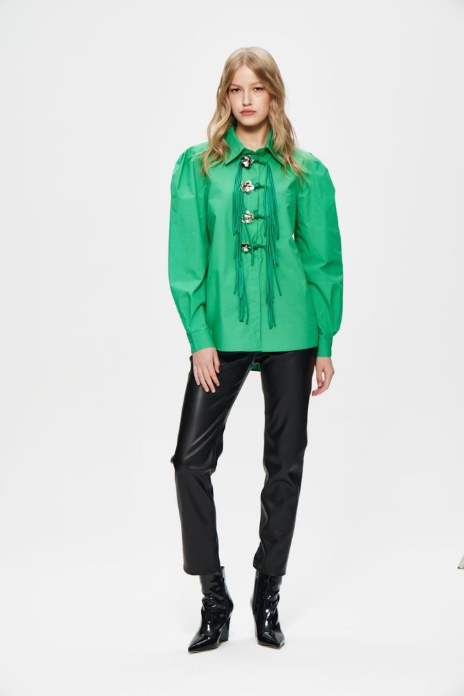 Рубашка яркого зеленого цвета с лентами и украшениями.