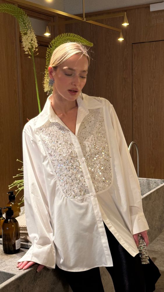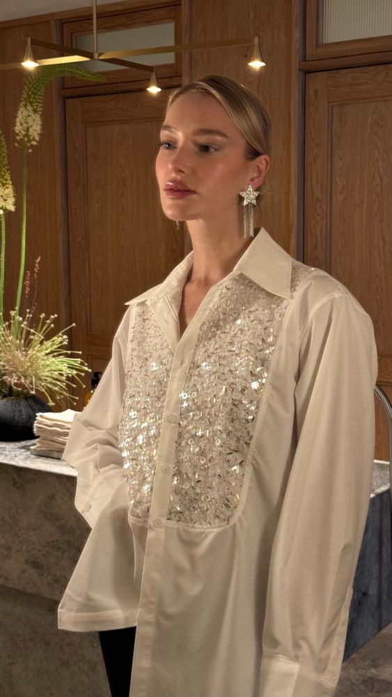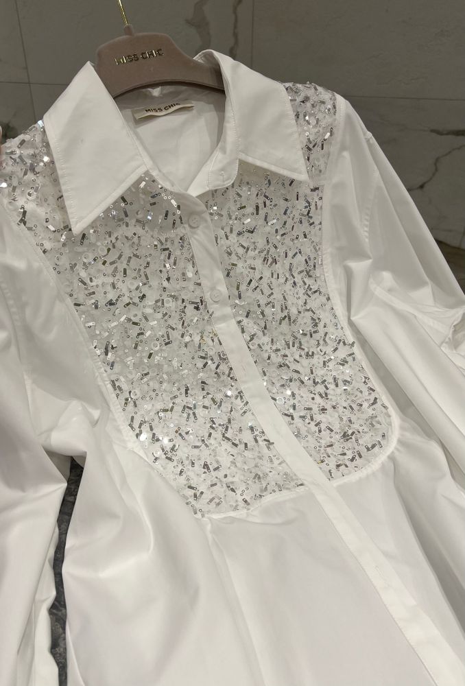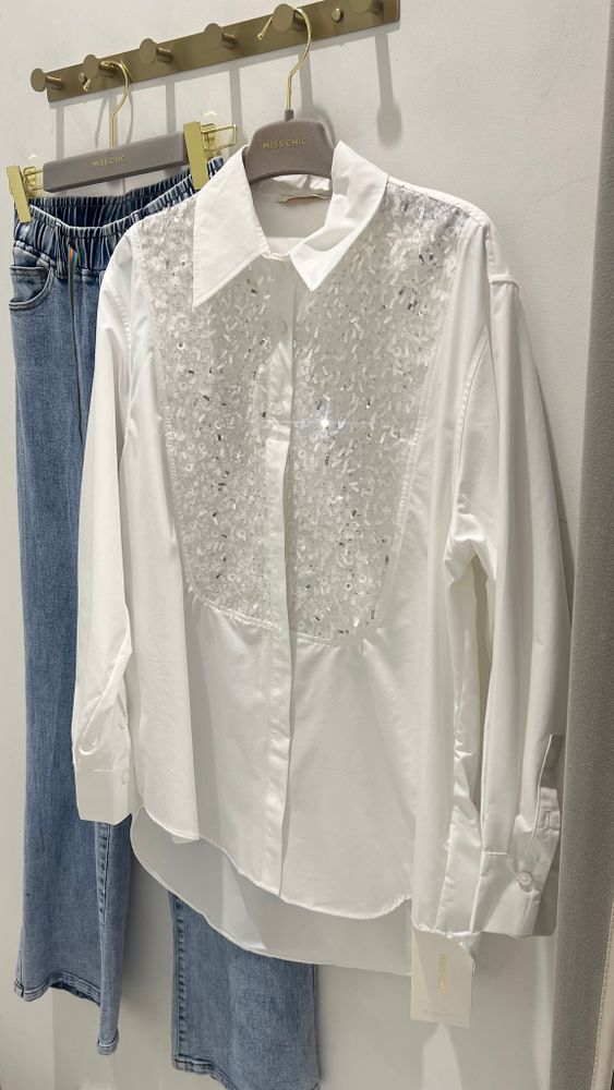 Белая хлопковая рубашка свободного кроя расшитая спереди пайетками разной формы.