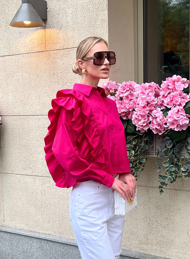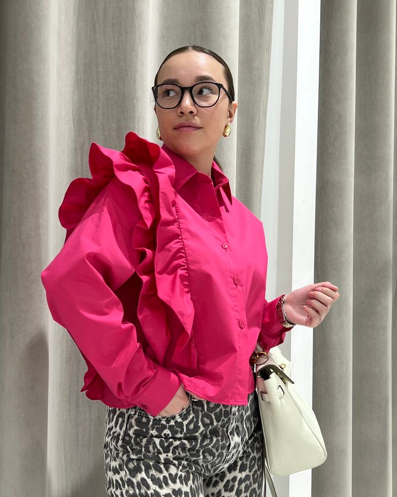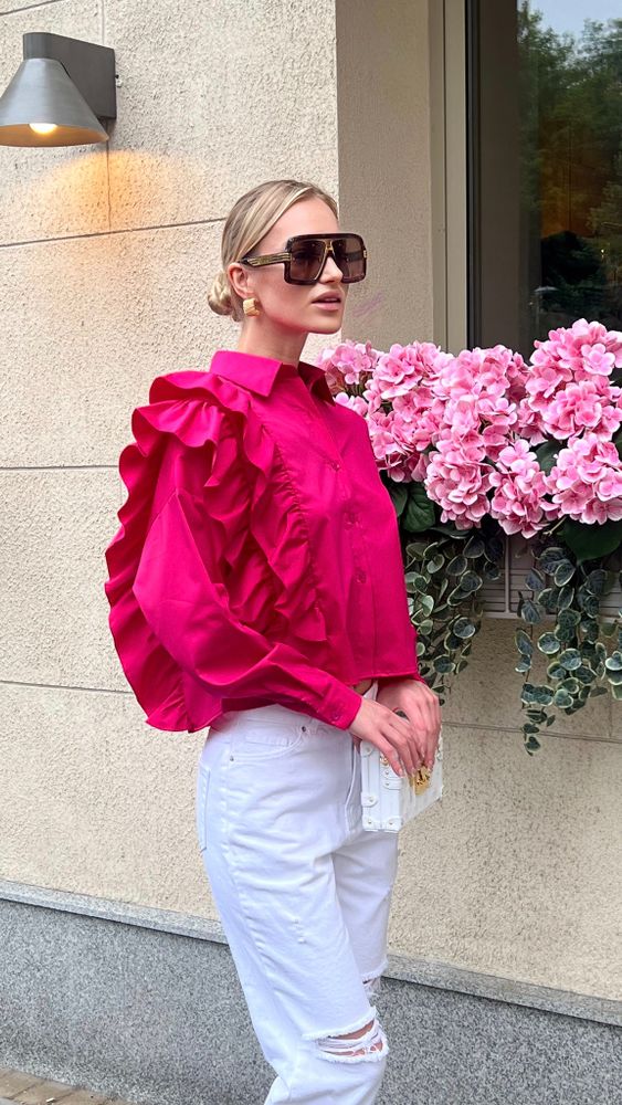 Женственная рубашка с воланами из натурального хлопка. Изготовлена из высококачественного материала, обеспечивая комфорт и удобство при носке. Ее оригинальный дизайн с оборкой на плече подчеркнет ваш индивидуальный стиль. Представлена в двух цветах: голубой и фуксия.