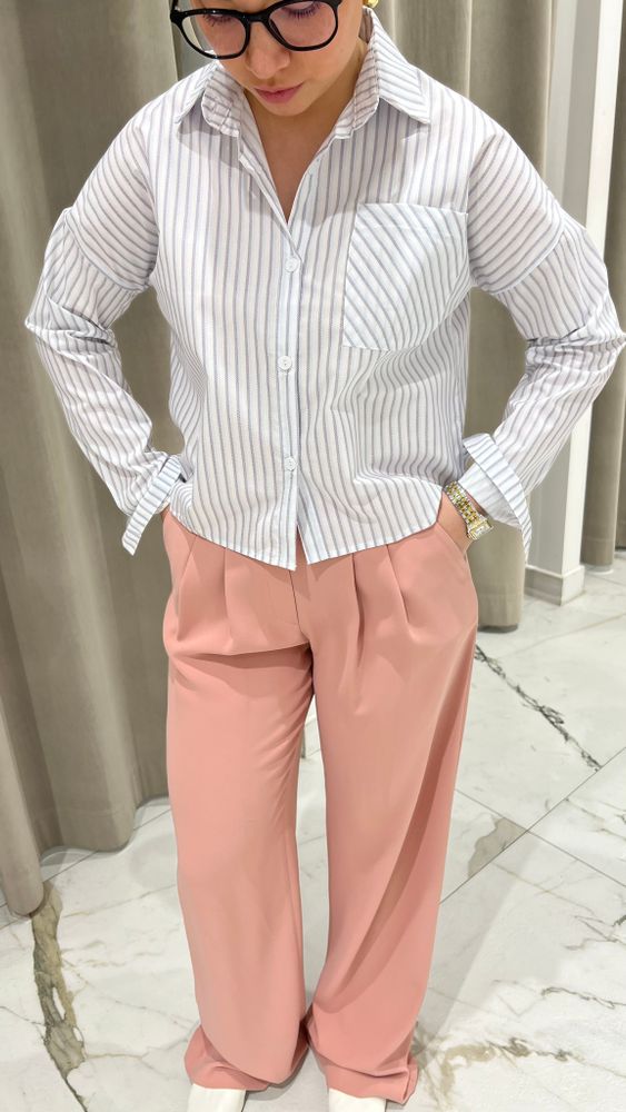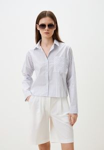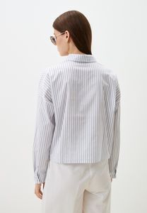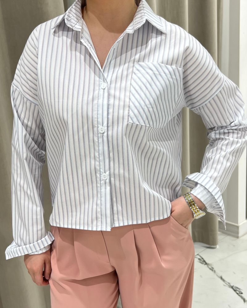 Стильная укороченная рубашка голубого оттенка в полоску с накладным карманом на груди. Изготовлена из натурального хлопка.
