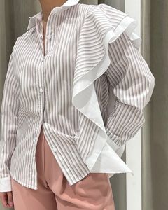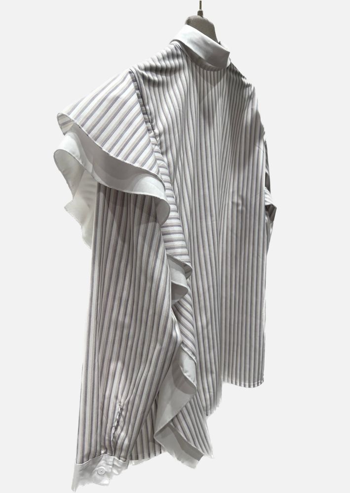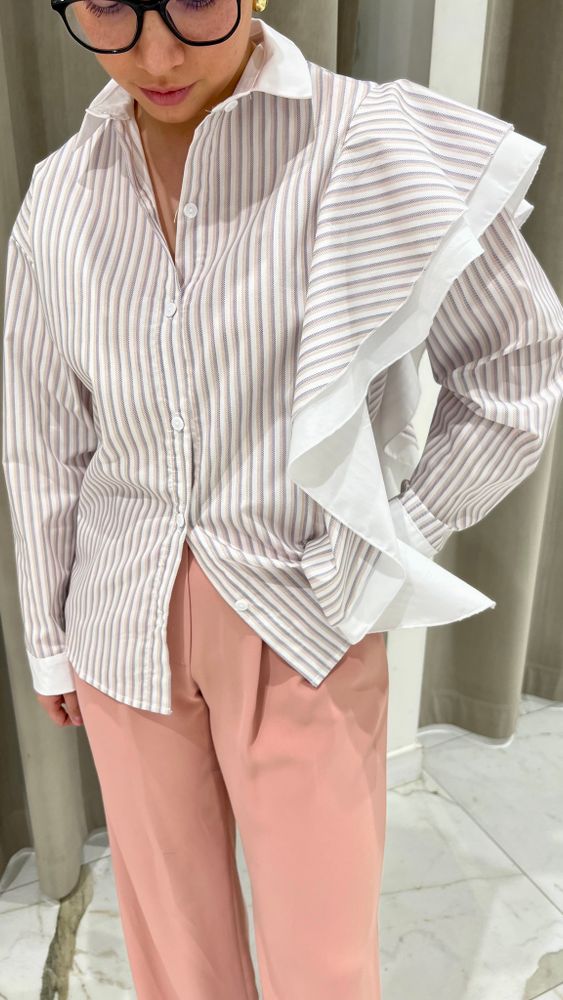 Рубашка свободного кроя в полоску с воланами на одном плече. Выполнена из высококачественного хлопка. Воланы добавляют особый шарм модели, делая ее уникальной.