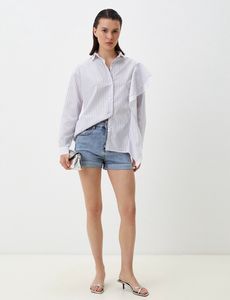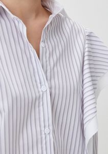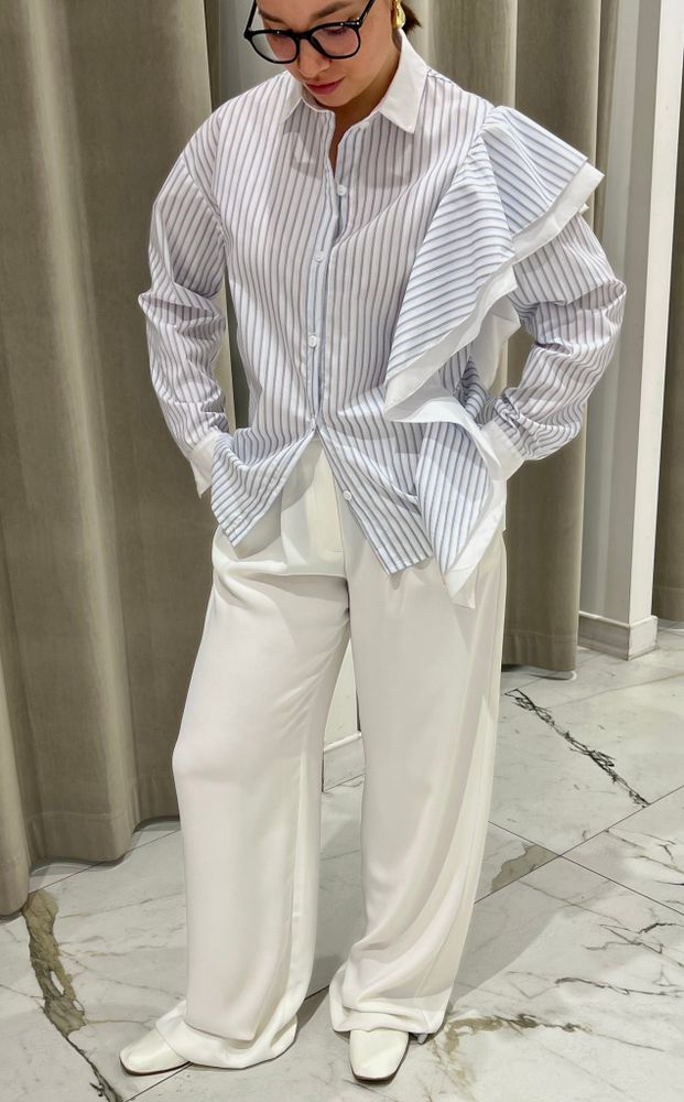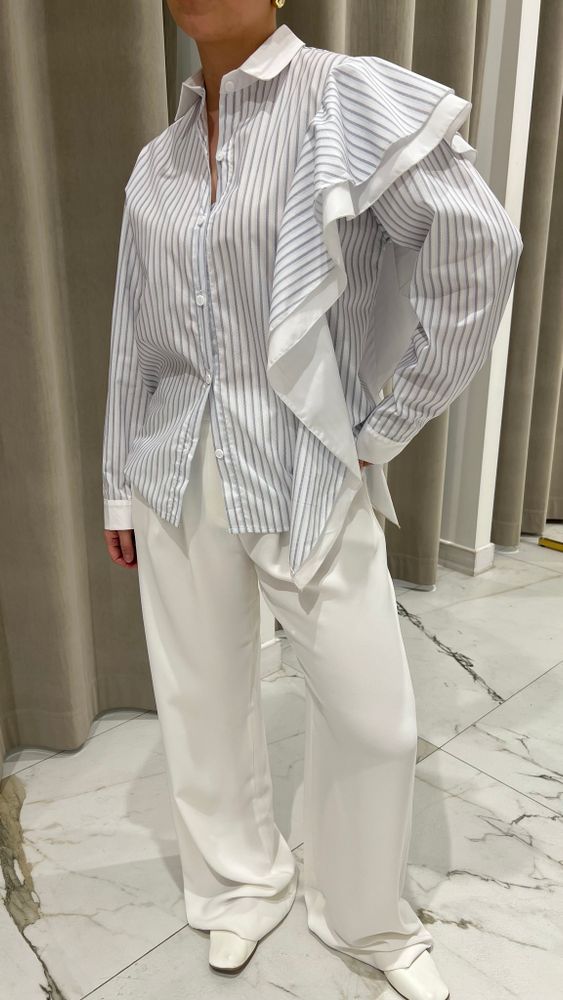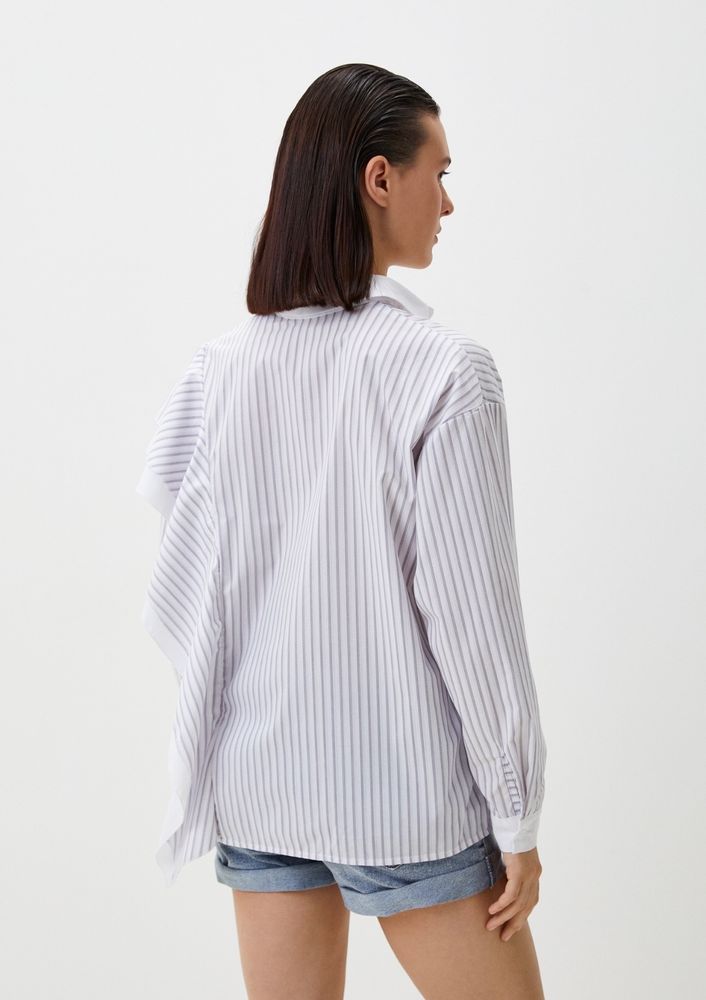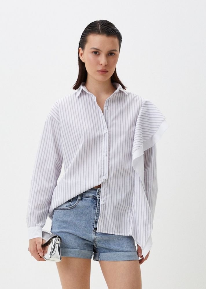 Рубашка свободного кроя в полоску с воланами на одном плече. Выполнена из высококачественного хлопка. Воланы добавляют особый шарм модели, делая ее уникальной.