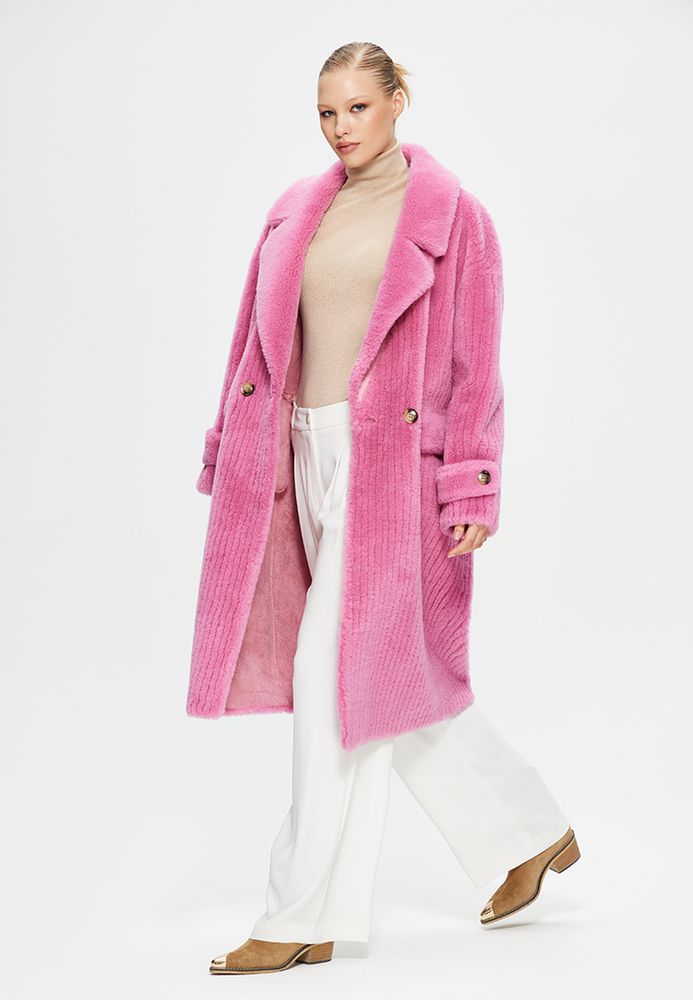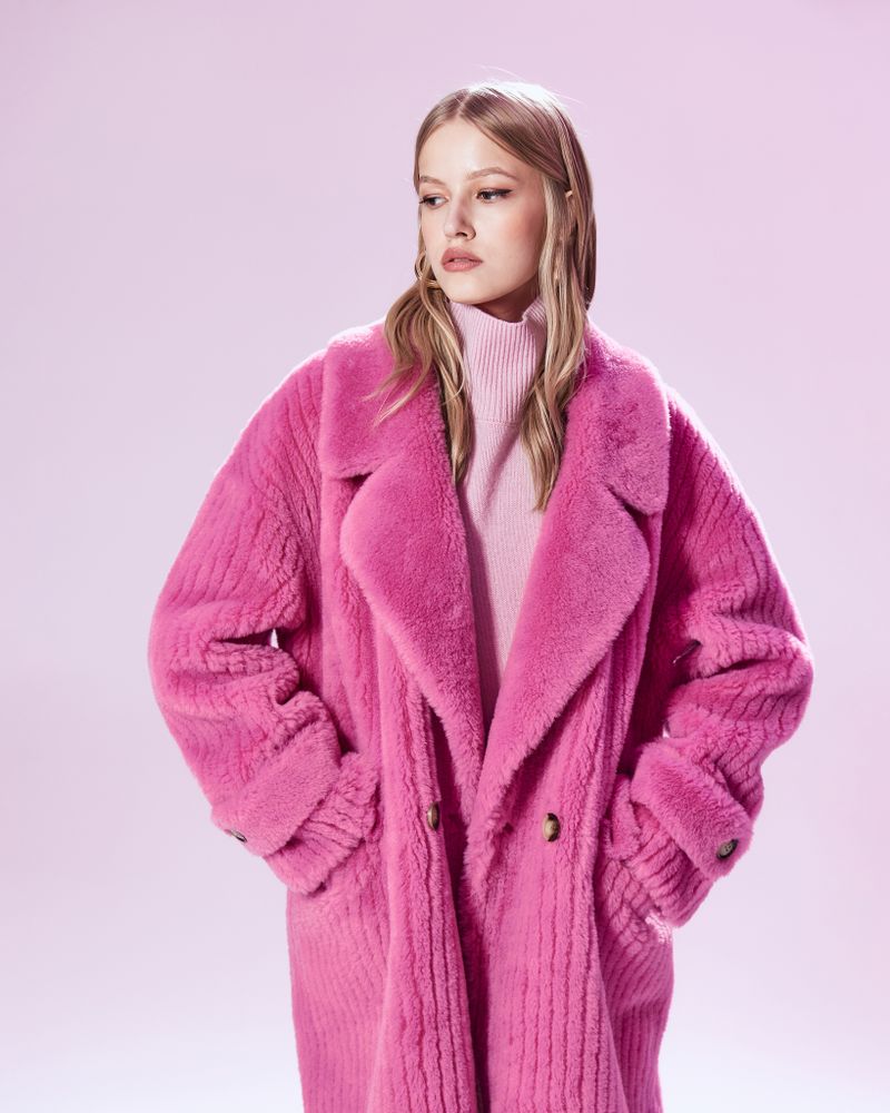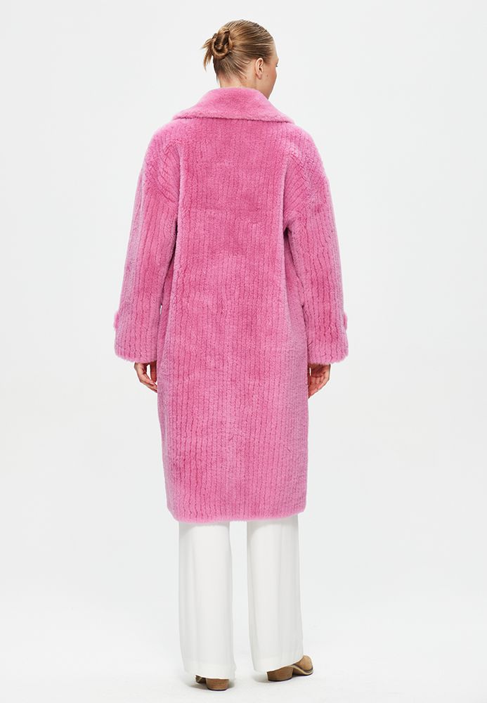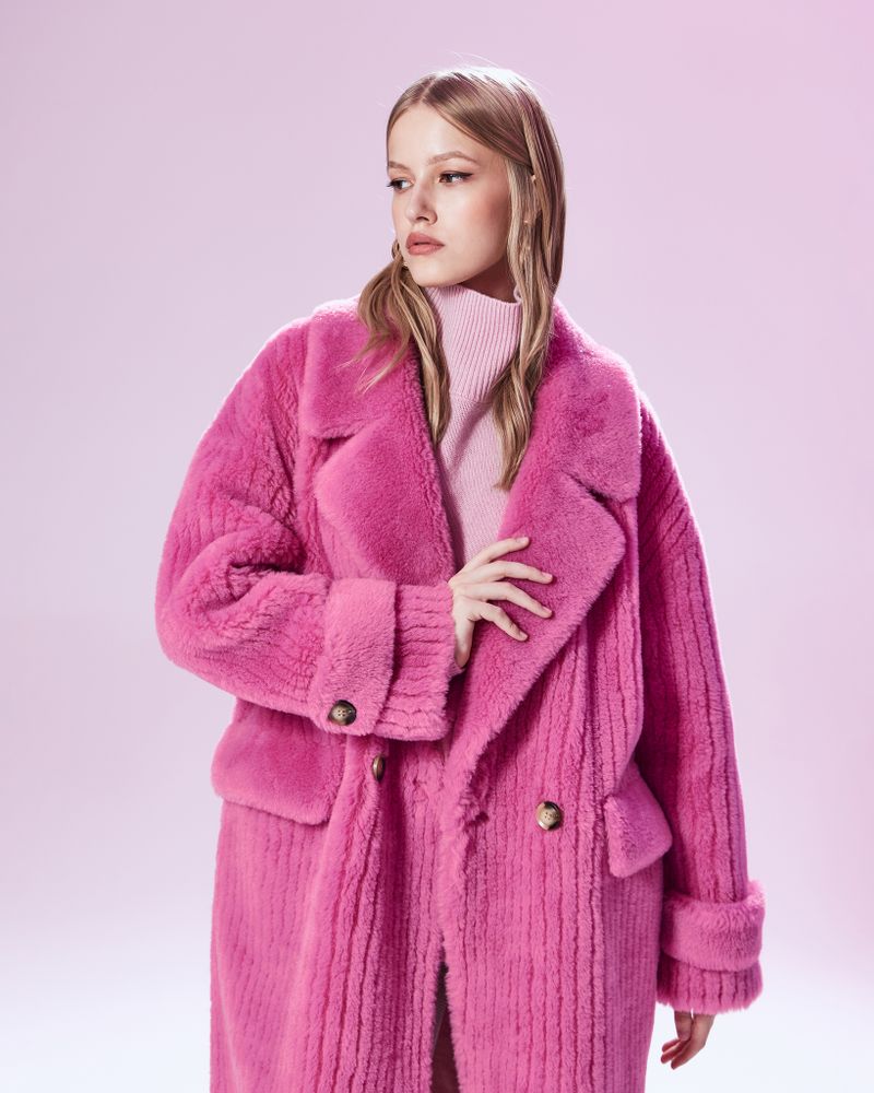 Роскошная шуба приятного розового цвета из натуральной овечьей стриженной шерсти, длинный ворс, температурный режим до -25 градусов мороза, еще большей оригинальности добавляет полосатая фактура шубы и объемный отложной воротник.