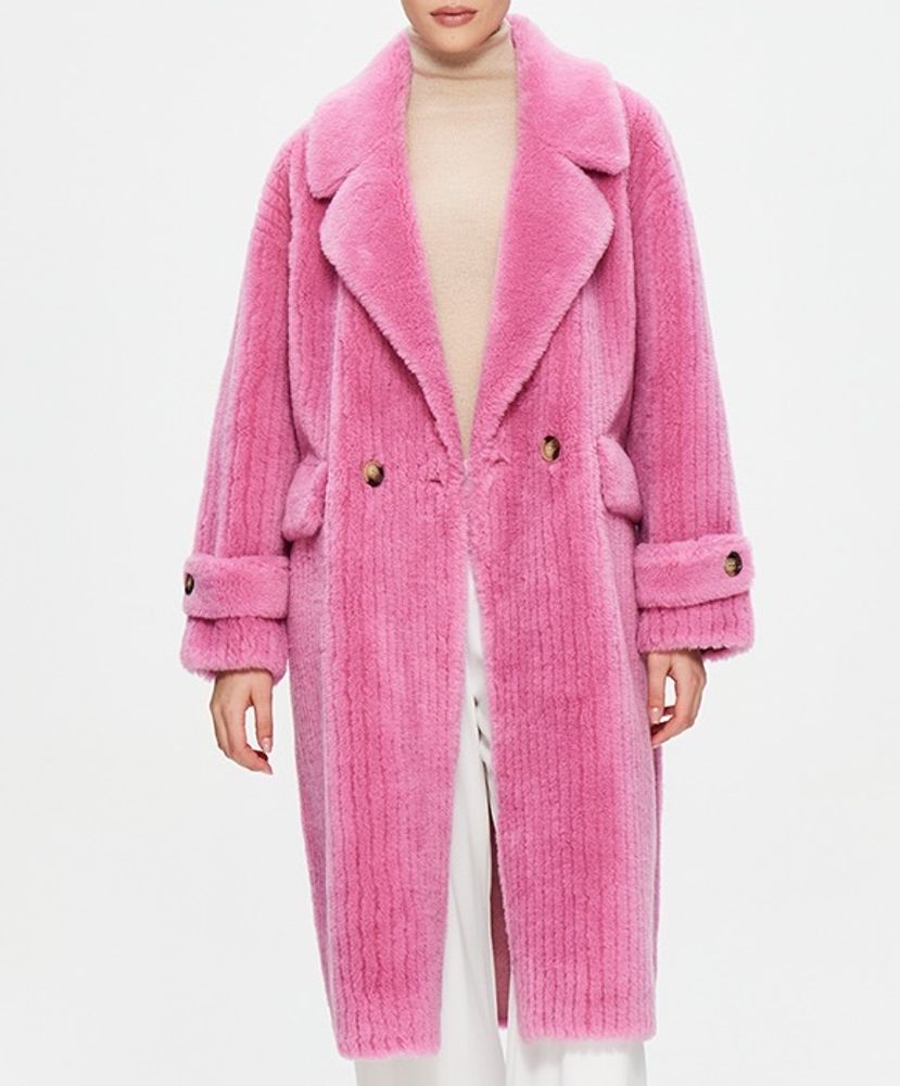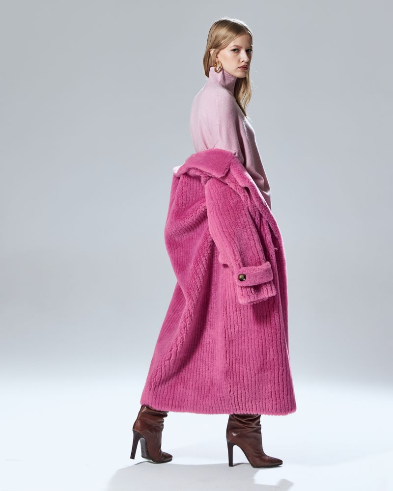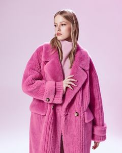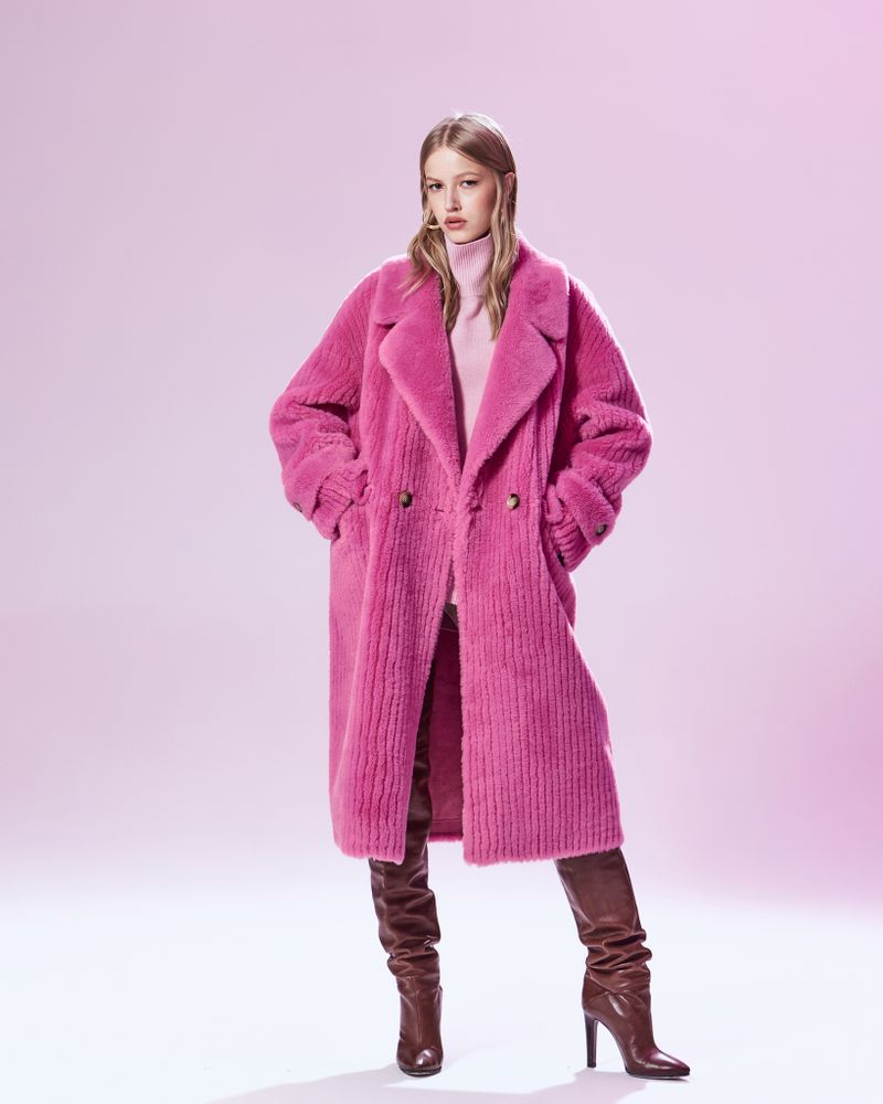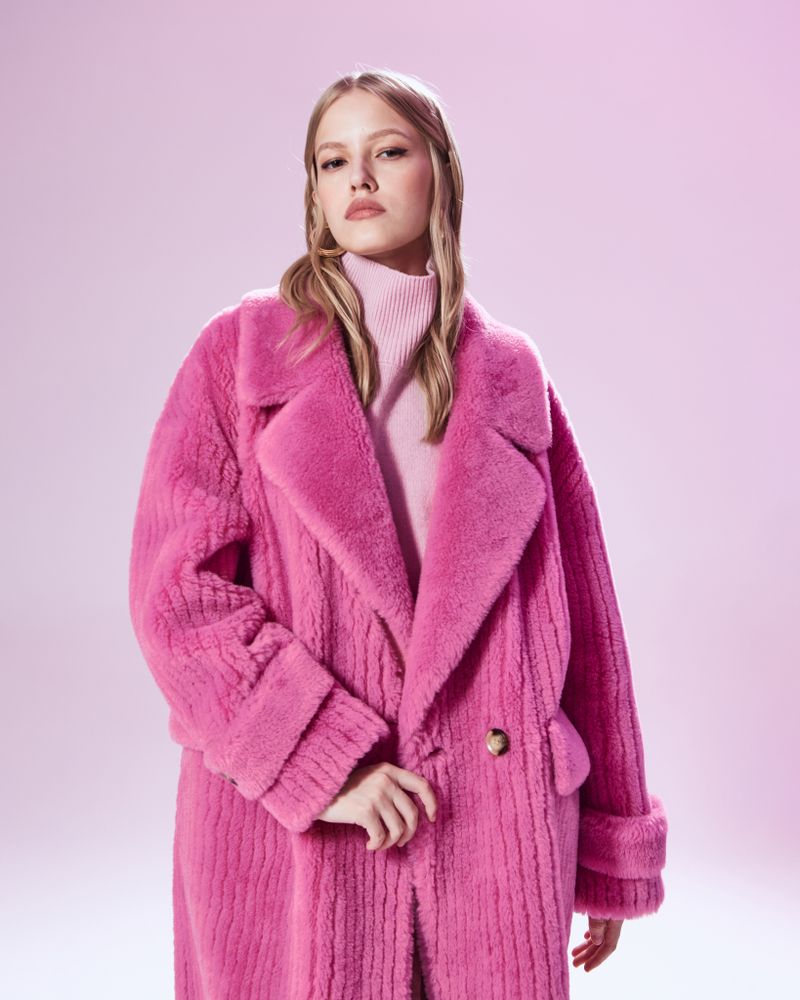 Роскошная шуба приятного розового цвета из натуральной овечьей стриженной шерсти, длинный ворс, температурный режим до -25 градусов мороза, еще большей оригинальности добавляет полосатая фактура шубы и объемный отложной воротник.
