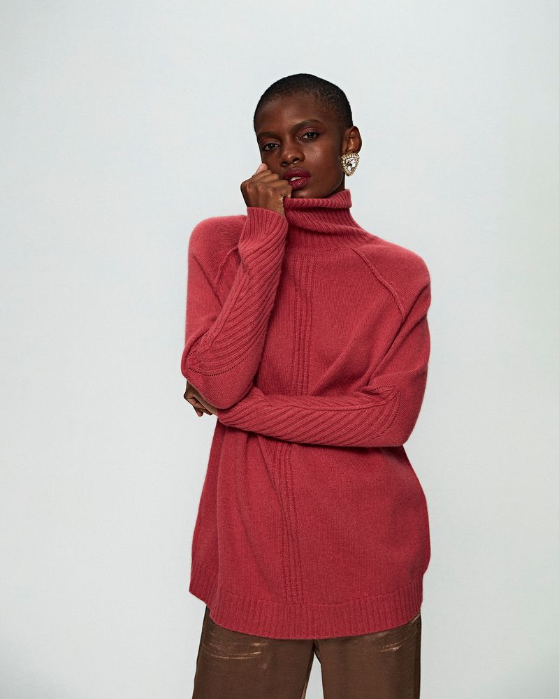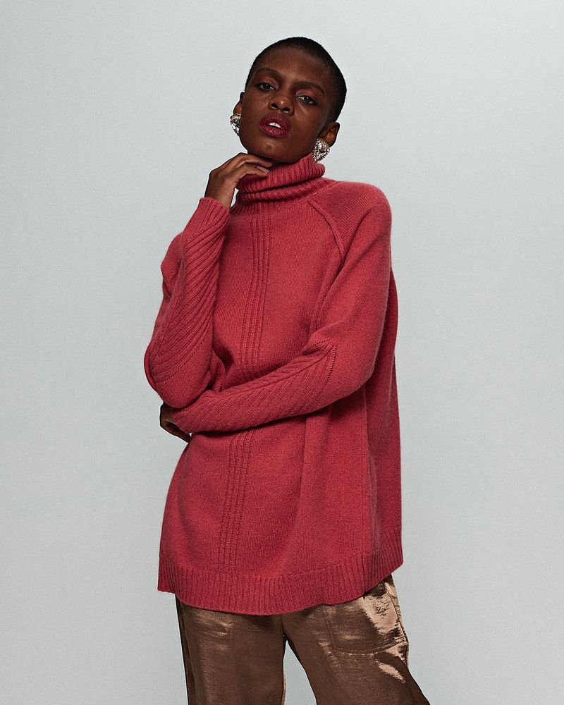 Удлиненный кашемировый свитер со швами и высоким горлом, очень теплый.