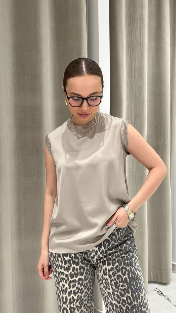 Топ из искусственного шелка с гофрированными элементами на рукавах и горловине. Изготовлен из качественного материала с эффектным плиссированным акцентом. Этот топ отлично сочетается как с классическими брюками, так и с джинсами или юбкой. Представлен в трех оттенках: белый, горчичный, капучино.
