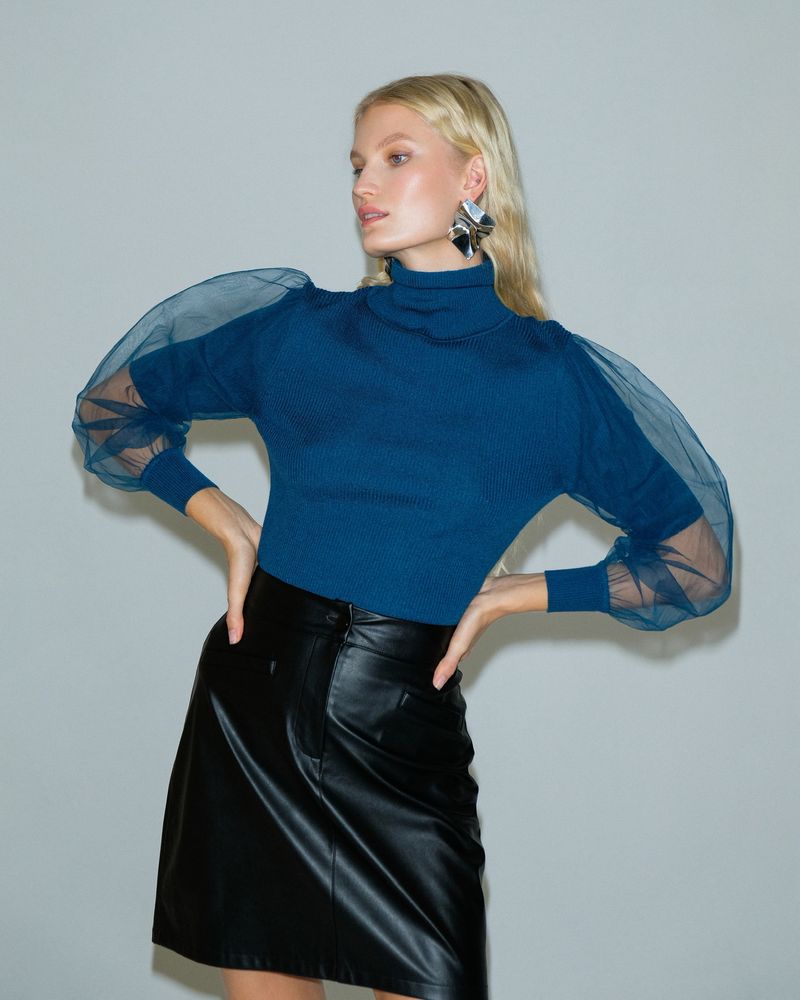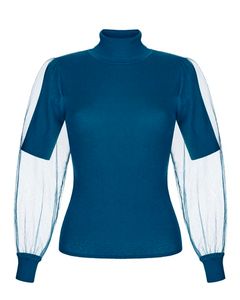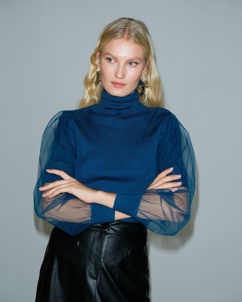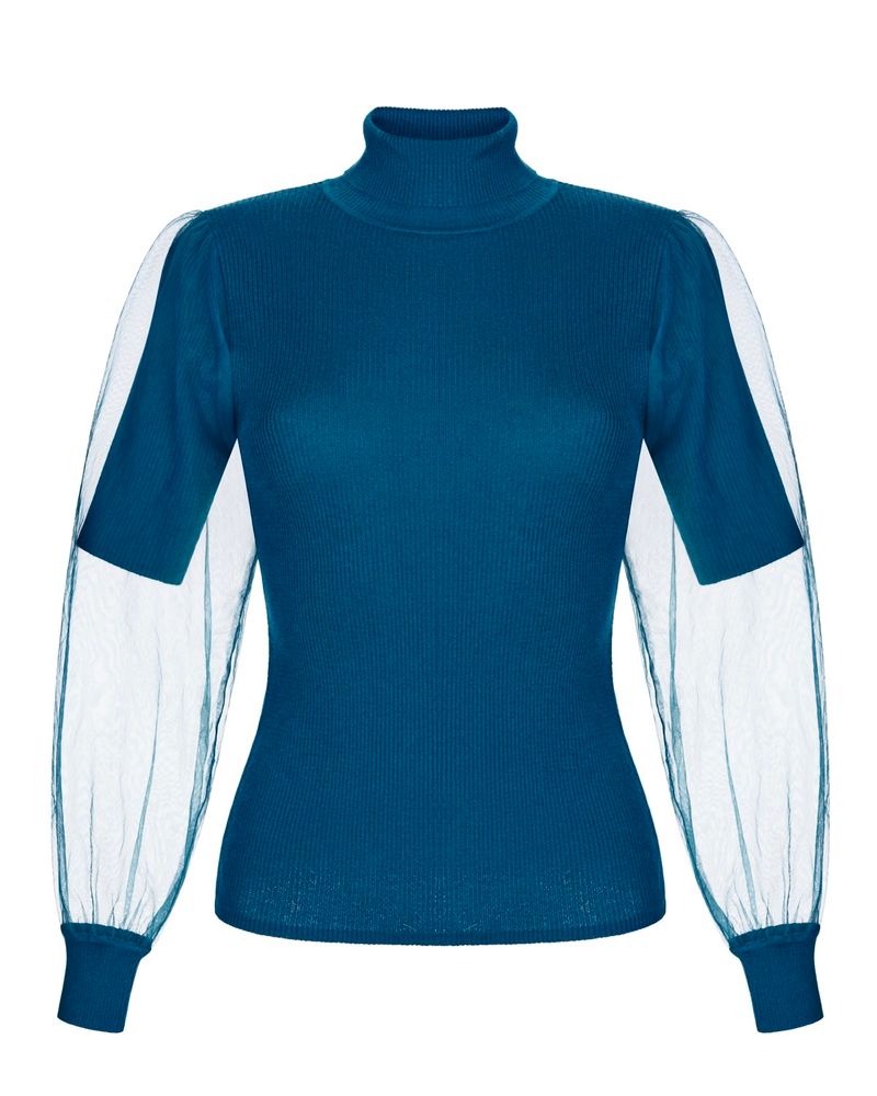 Водолазка шерстяная с шерстью и вискозой в составе, ультратонкая, износостойкая нарядная водолазка с фатином на рукавах.