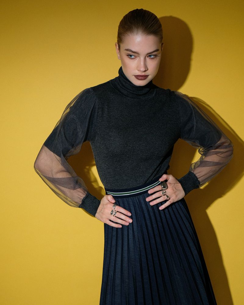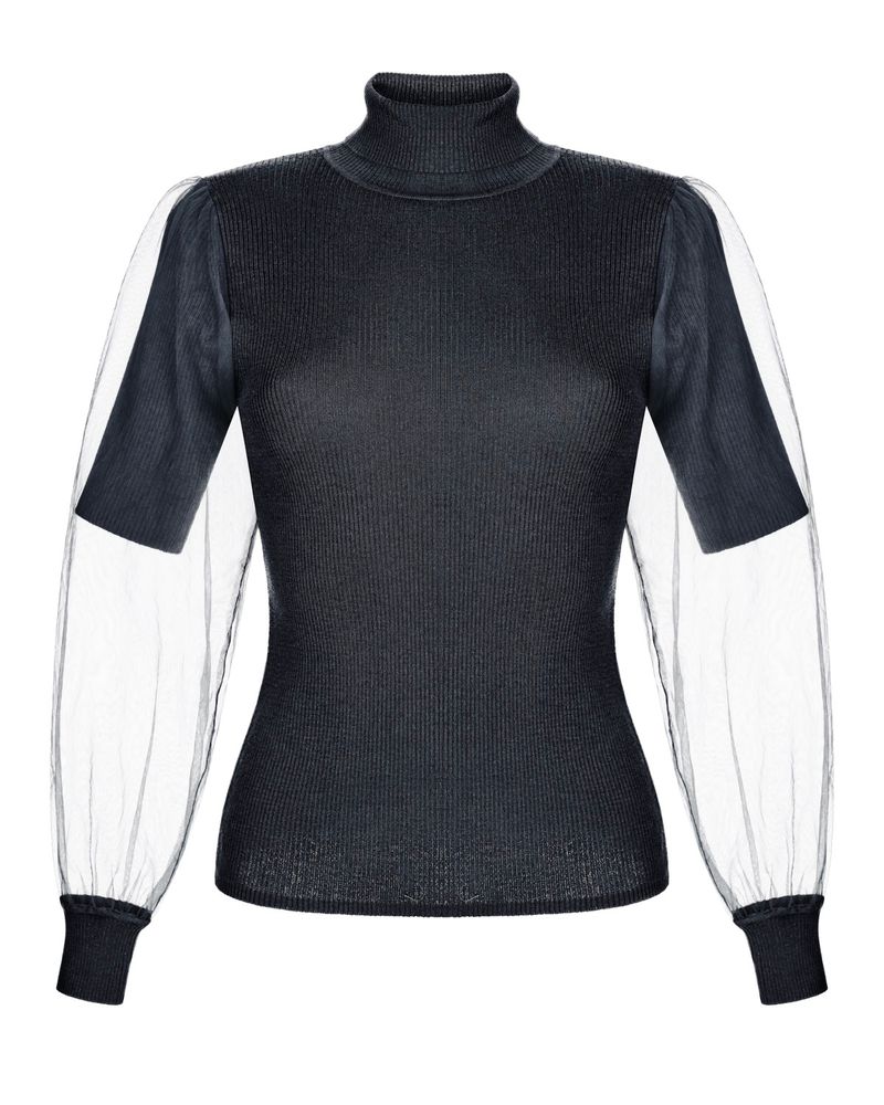 Водолазка шерстяная с шерстью и вискозой в составе, ультратонкая, износостойкая нарядная водолазка с фатином на рукавах.