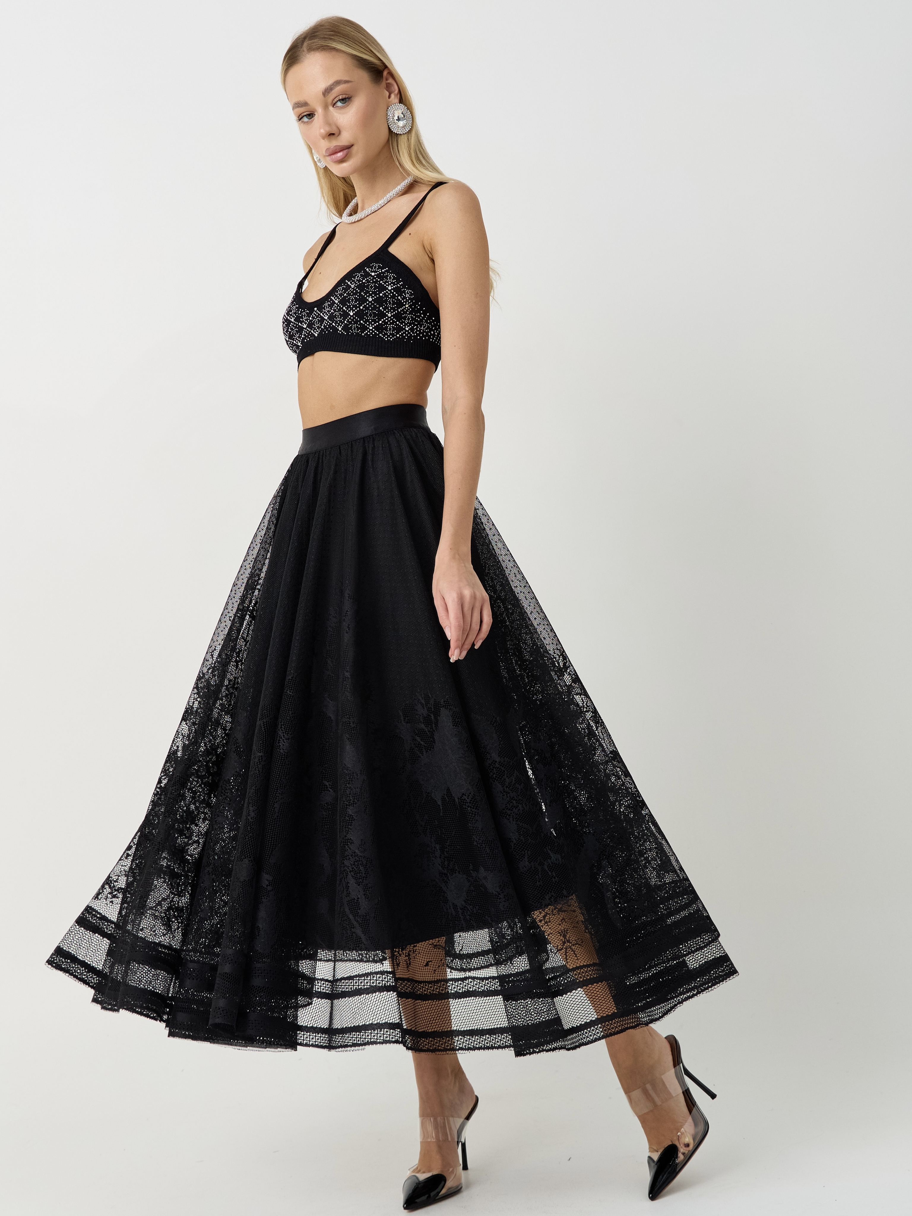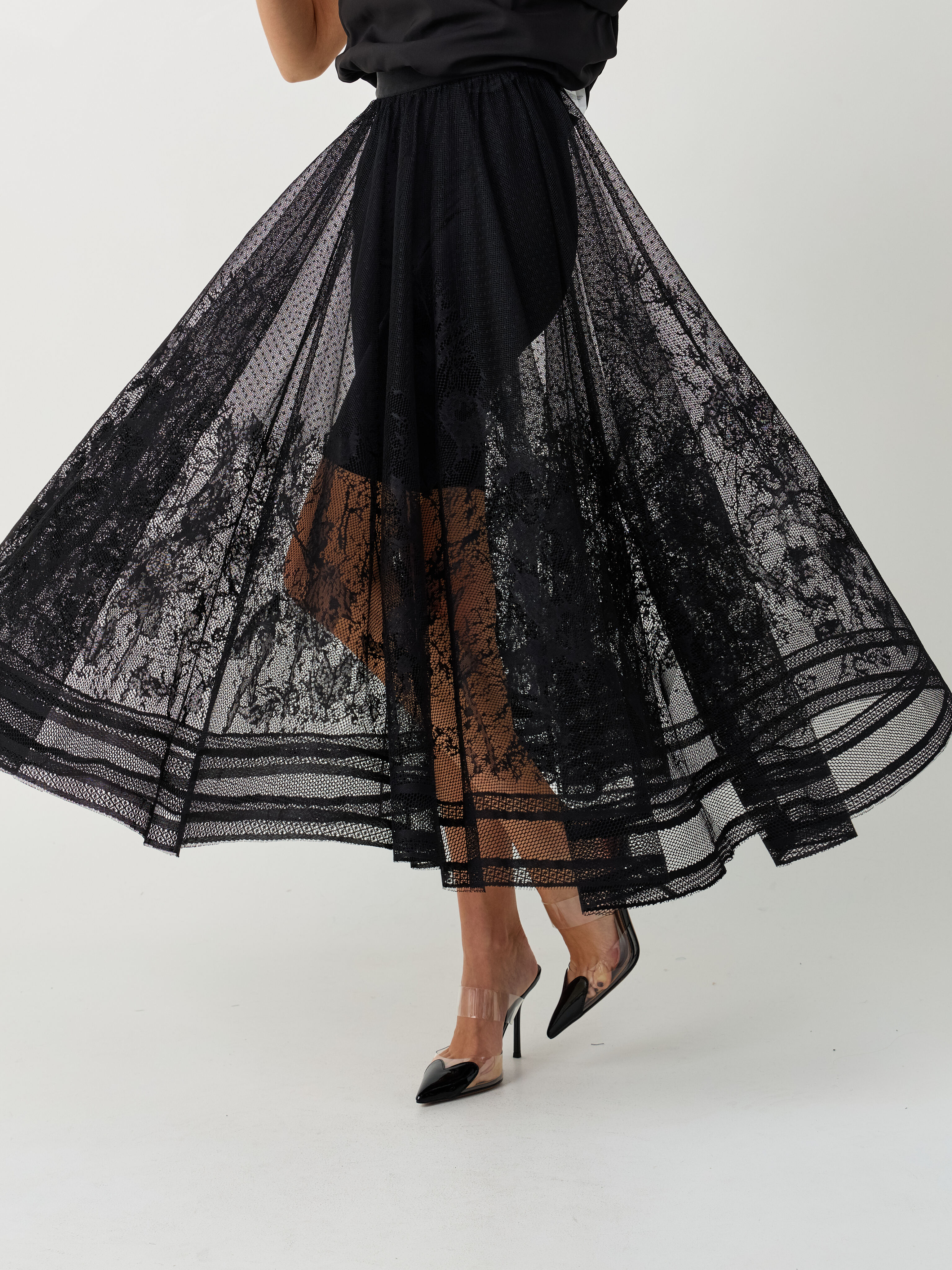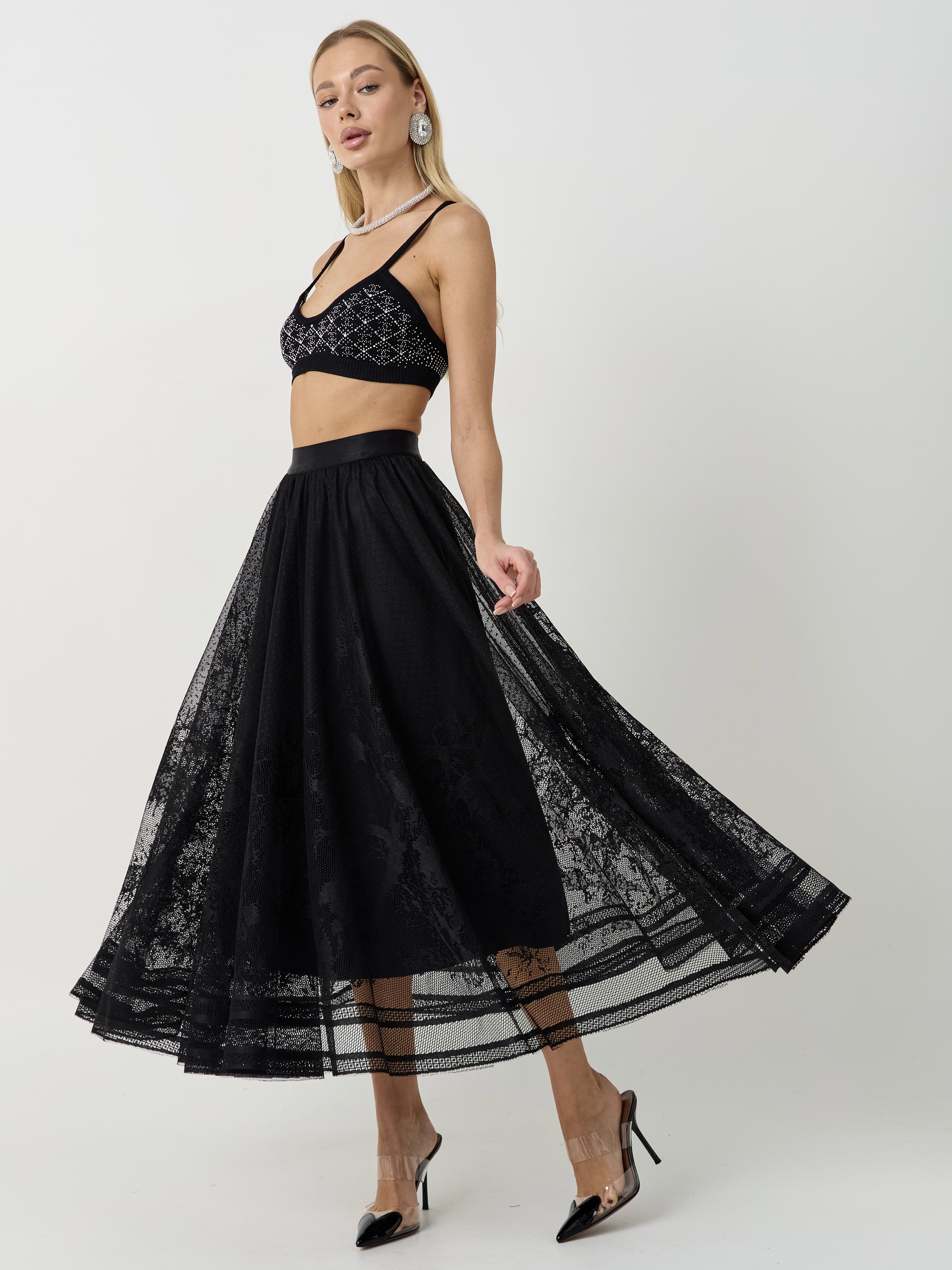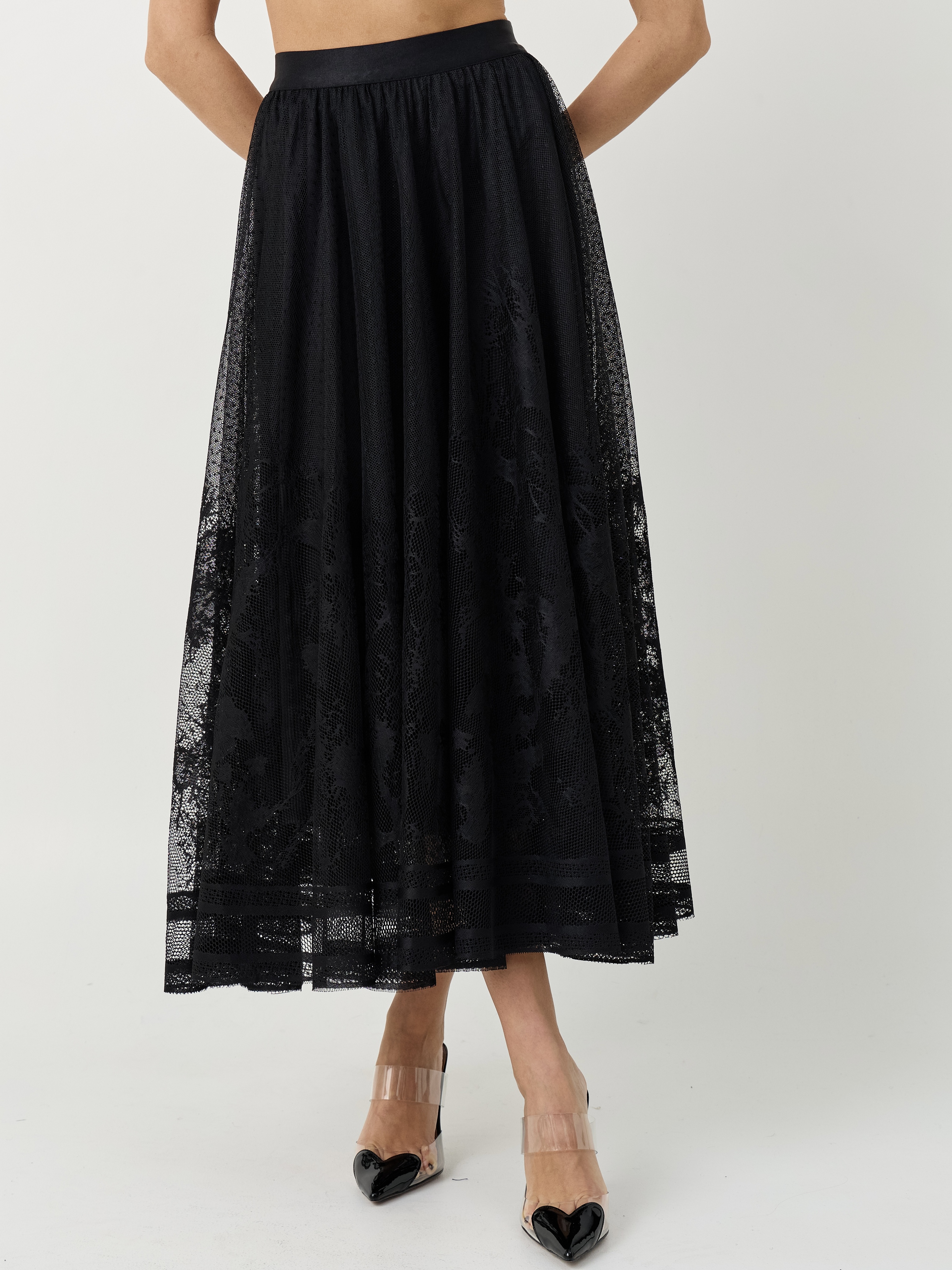 Роскошная пышная юбка в длине миди из гипюра с оригинальным узором, талия на резинке.