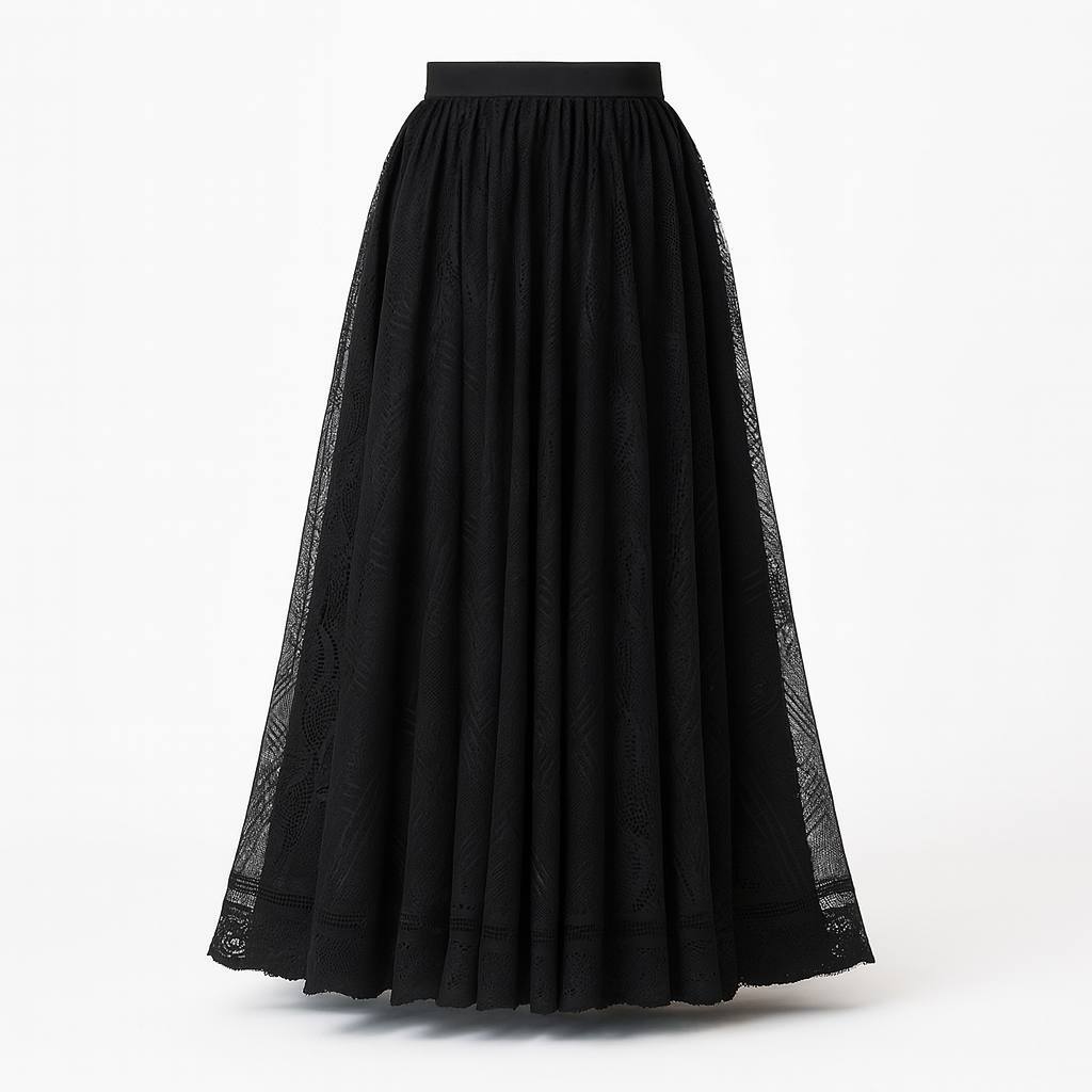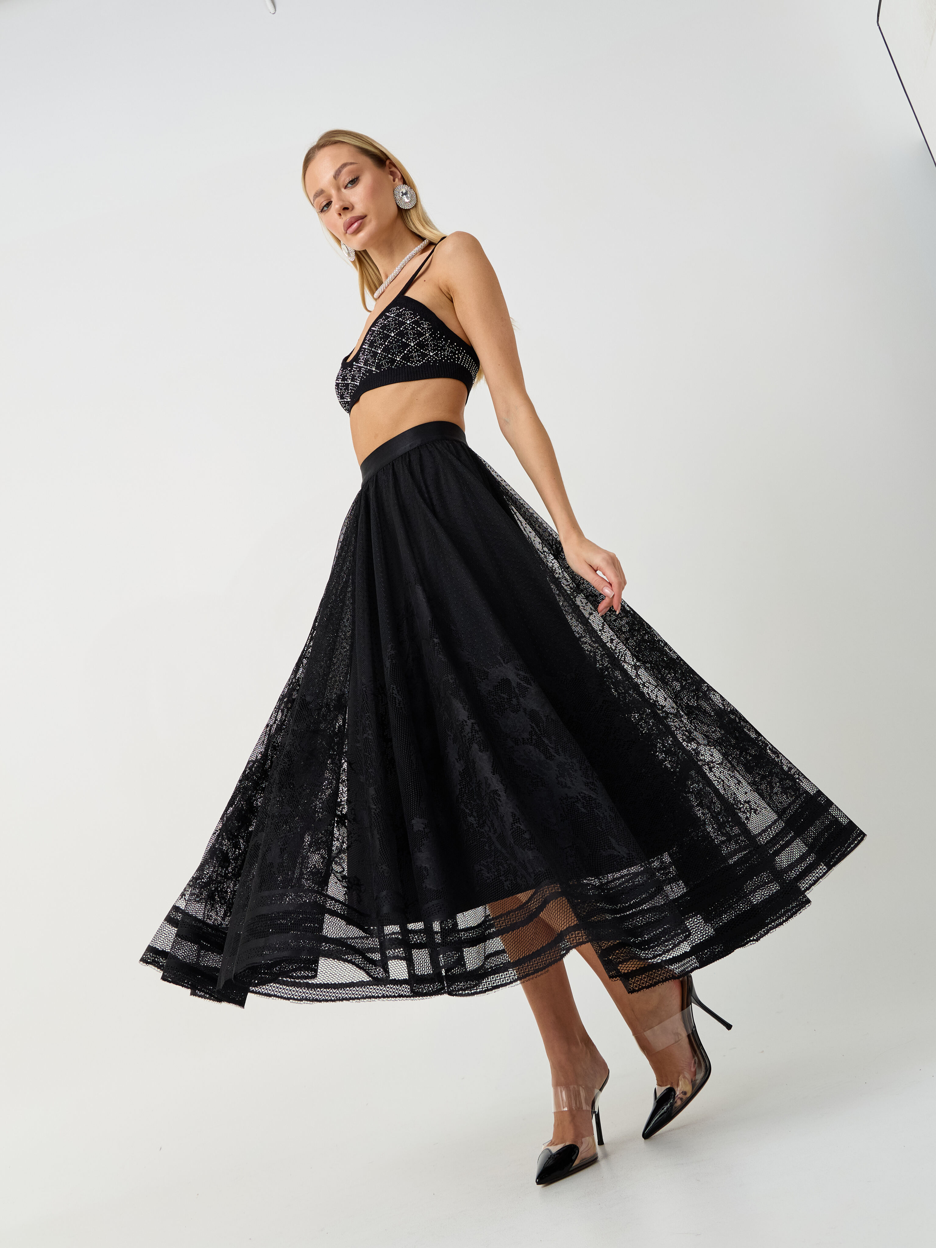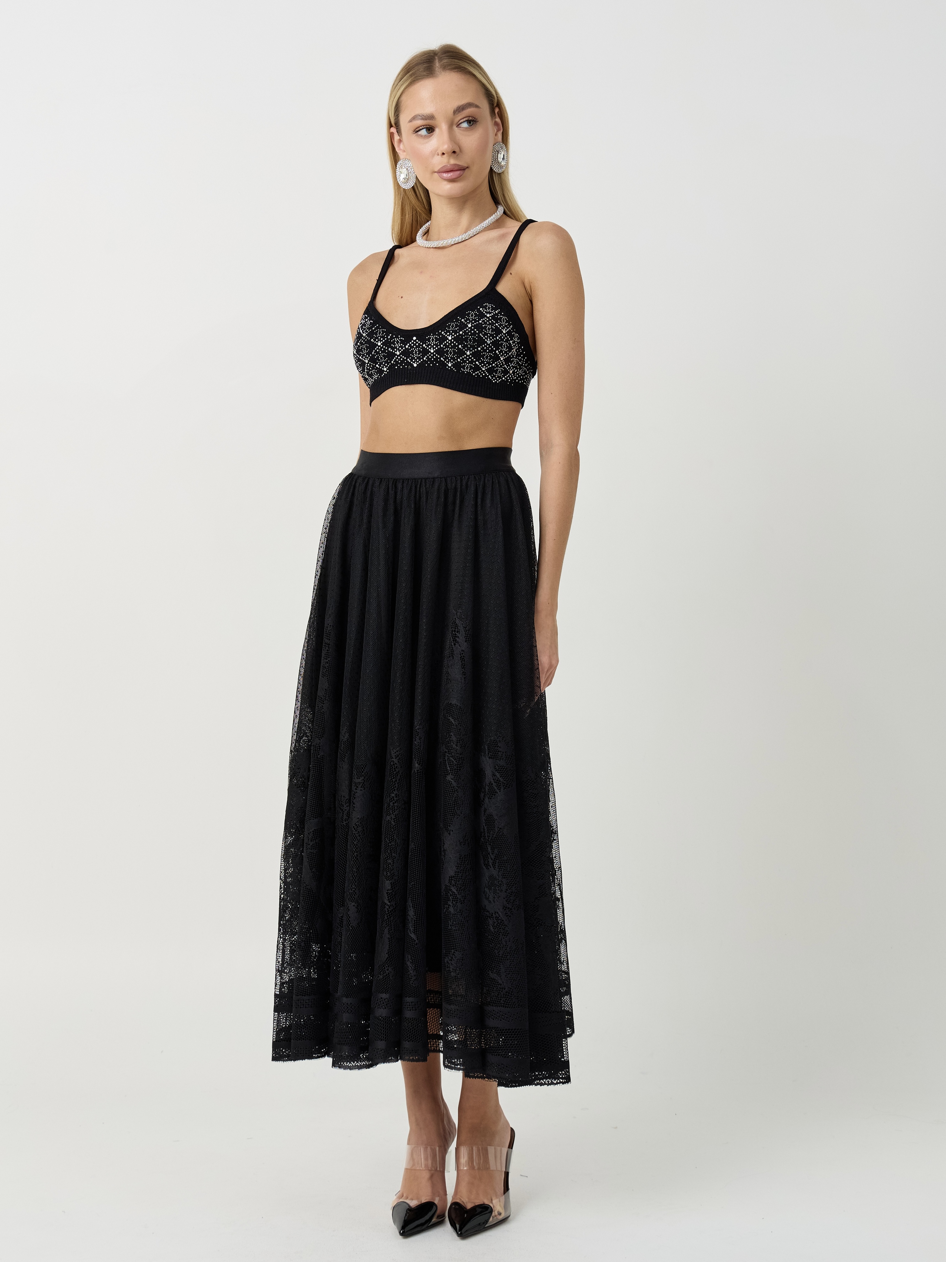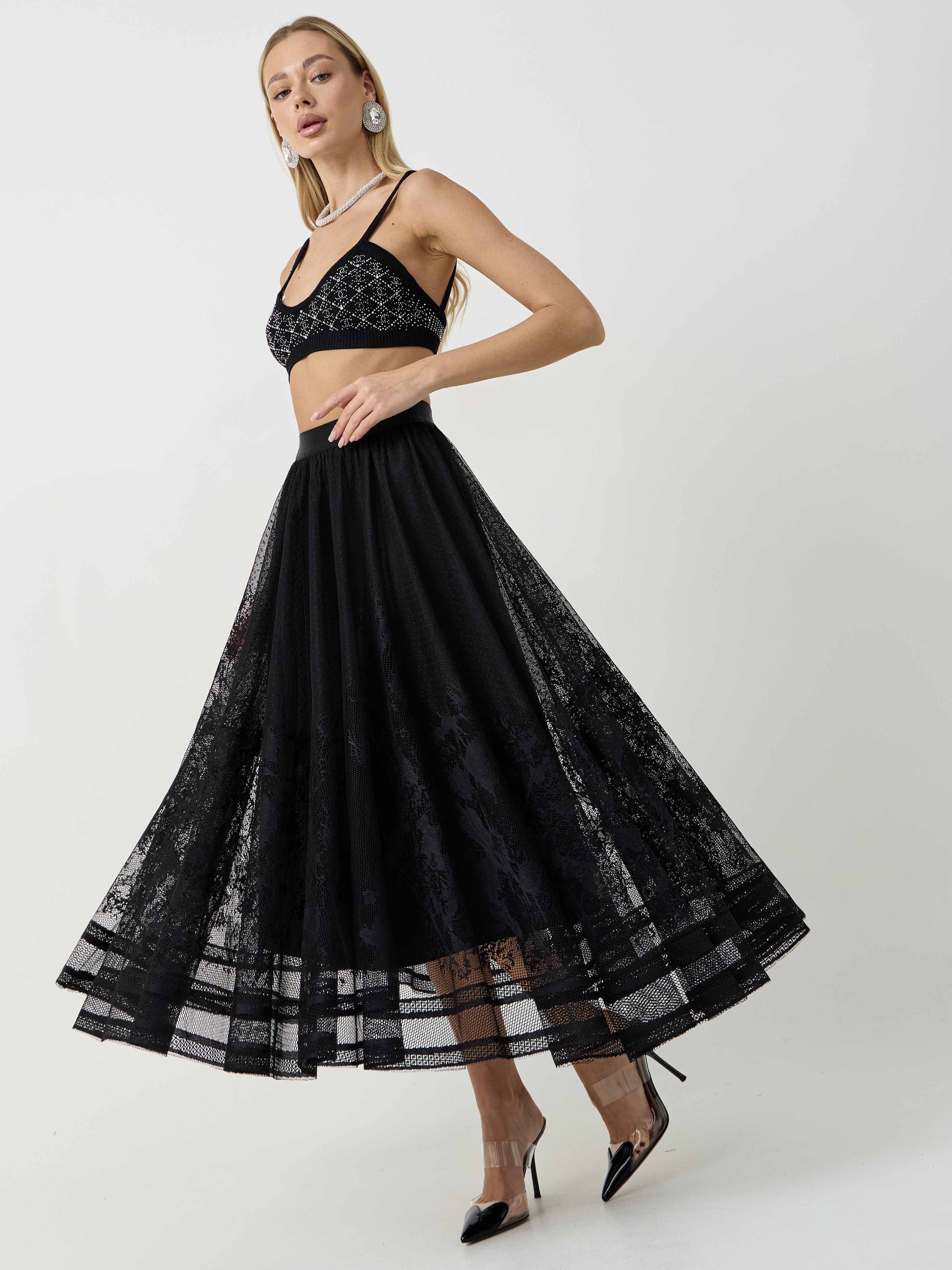 Роскошная пышная юбка в длине миди из гипюра с оригинальным узором, талия на резинке.