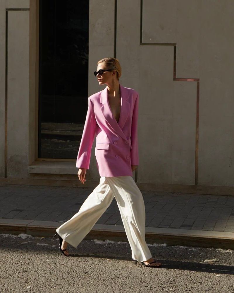 Двубортный жакет в нежном розовом цвете с пуговицами в тон.
